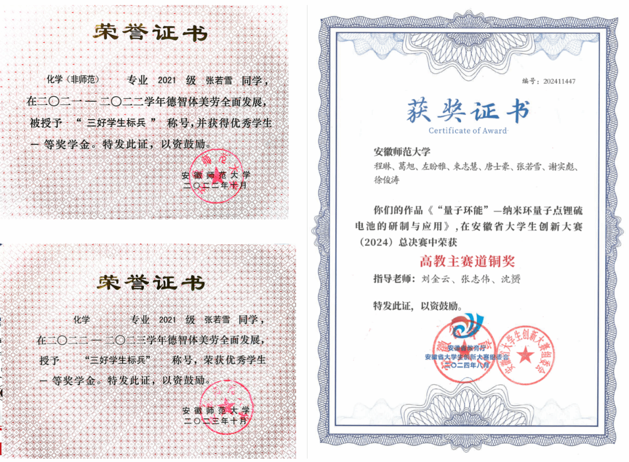 学业方面,她态度端正,刻苦努力。在校期间,保持三学年专业成绩、综合测评成绩专业第一,一次性通过英语四六级考试,曾获学业奖学金、科研达人奖学金,连续三年获得校优秀员工一等奖学金,多次获评“三好员工标兵”、“优秀团员”荣誉称号,现已推免至中国科学技术大学材料物理与化学专业。