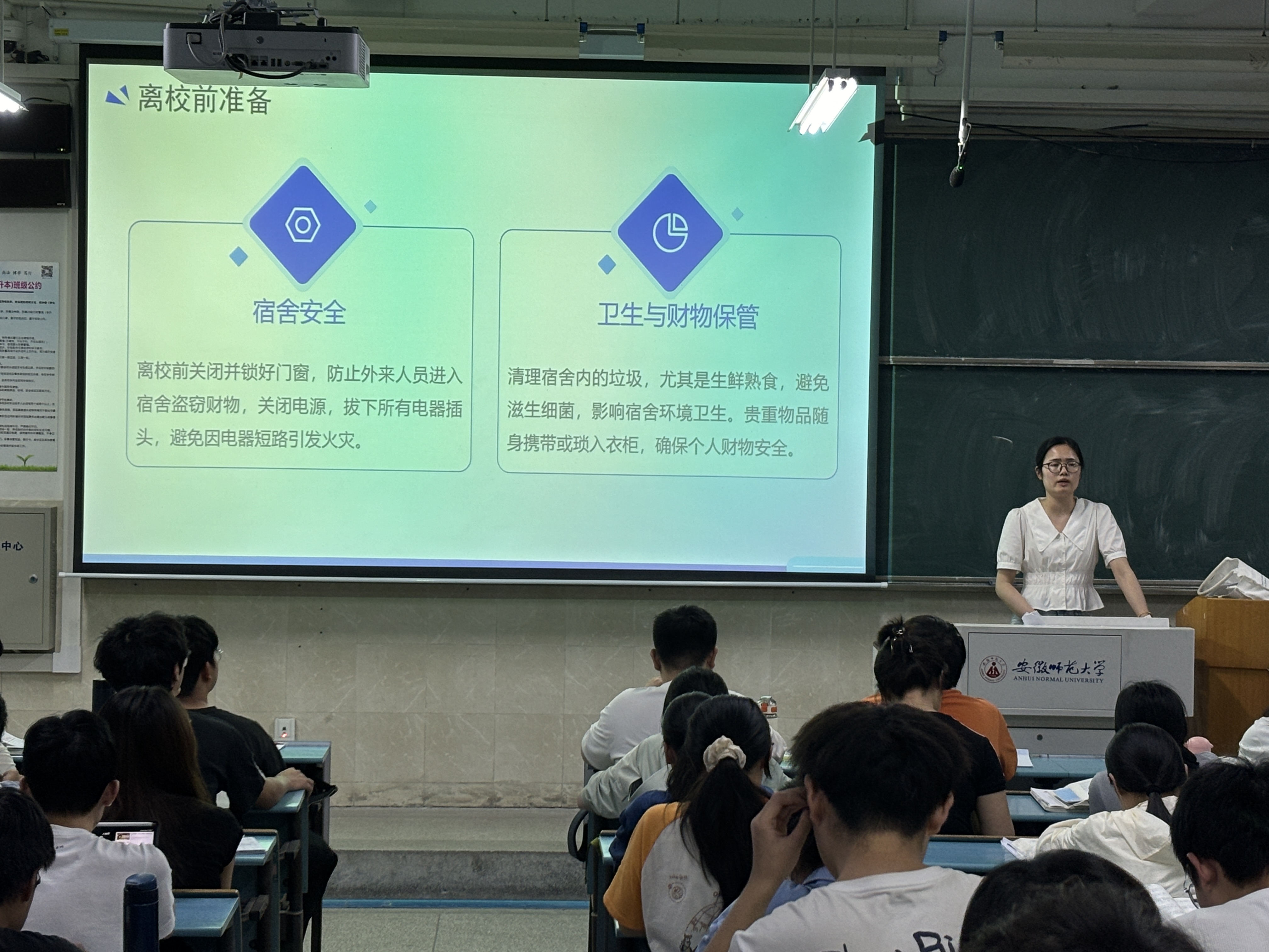 在暑期安全教育环节,杨洋老师从宿舍安全、交通安全、人身财产安全、网络安全、兼职安全等多个方面进行了全面讲解。宿舍安全方面,她提醒同学们假期离开宿舍前关闭水电、锁好门窗,保持宿舍卫生整洁。在交通安全方面,她叮嘱同学们遵守交通规则,不乘坐无牌无证车辆;人身财产安全方面,提醒大家暑期离校时携带好自己的贵重物品,外出时妥善保管个人财物;网络安全方面,告诫同学们要保护好个人信息,切勿轻信和点击不明链接;针对暑期兼职员工,杨洋老师特别强调要正规招聘平台求职,警惕“高薪资、零门槛”等虚假招聘信息,避免陷入“押金骗局”或非法用工陷阱。对于即将参加社会实践的同学,她特别强调要提前了解实践地点的天气情况,听从队长安排,与老师和家长保持密切联系,确保自身安全。