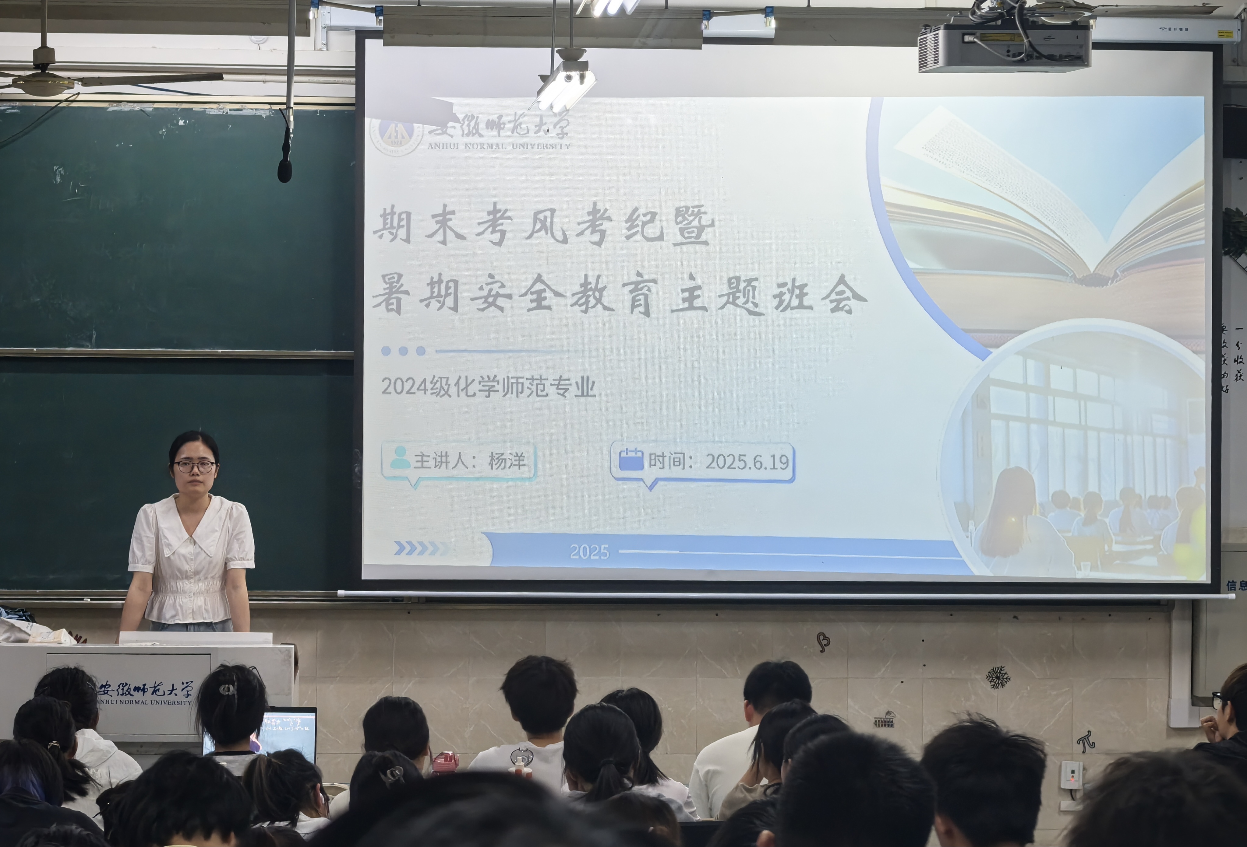 为强化员工诚信考试意识,提升暑期安全防范能力,2024级化学师范专业于2025年6月19日晚在行知楼1号楼2010302、2010303、2010304教室召开期末考风考纪暨暑期安全教育主题班会。本次班会由辅导员杨洋主持,2024级化学师范专业全体员工参加。