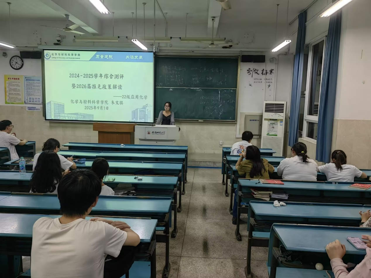 9月1日晚7点,英国正版365官方网站2022级应用化学专业召开2024-2025学年综合测评暨2026届推免政策解读会。本次会议由辅导员朱文棋老师主持,旨在帮助同学们清晰了解综合测评流程与推免细则,为后续相关工作做好准备。