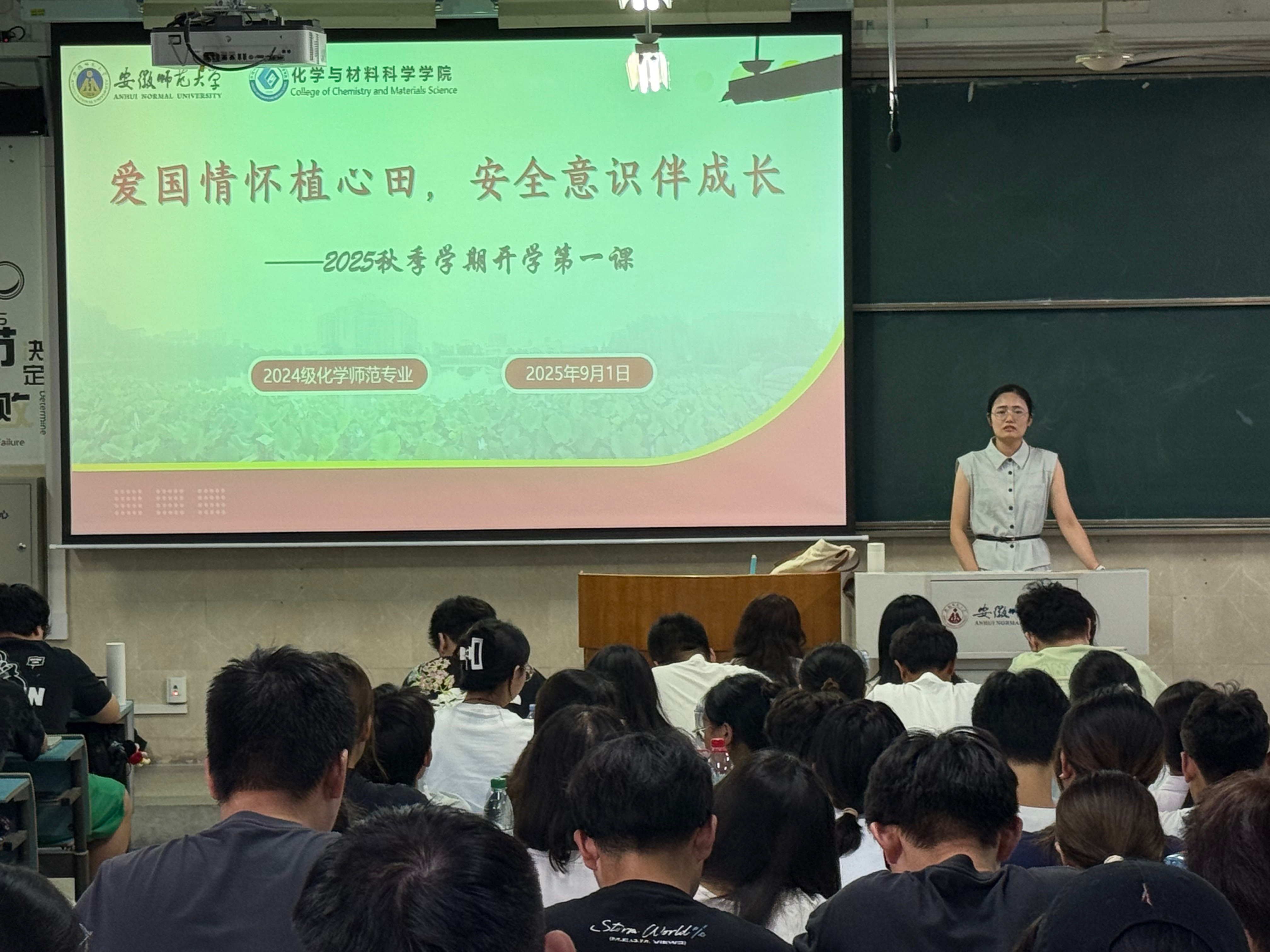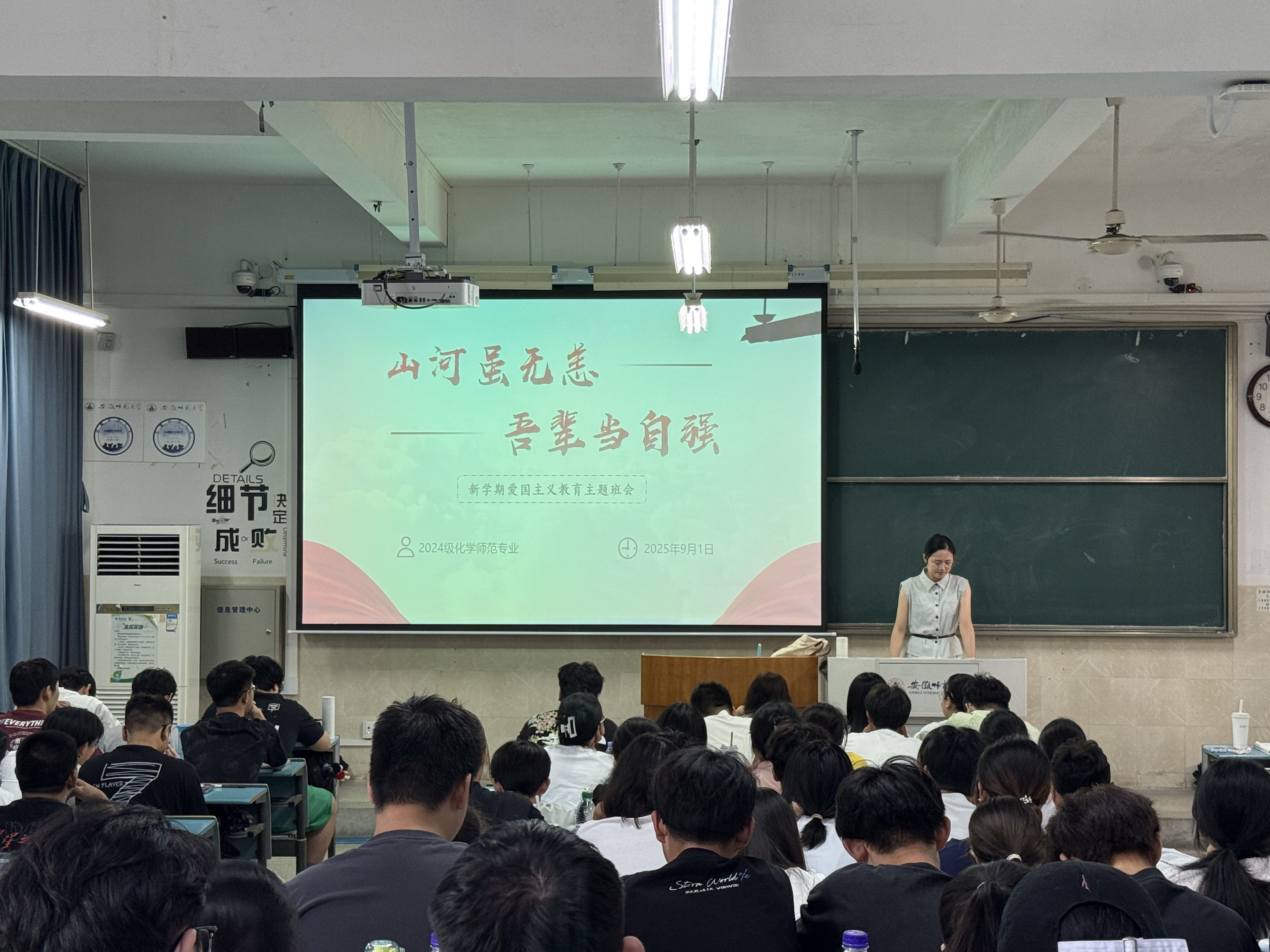 为加强老员工爱国主义教育,弘扬伟大抗战精神,同时扎实做好新学期开学安全稳定工作,引导同学们以积极饱满的精神面貌投入校园生活,9月1日晚,辅导员杨洋在1号教学楼302、303和304教室为2024级化学师范专业员工召开了以“爱国情怀植心田,安全意识伴成长”为主题的开学第一课班会。