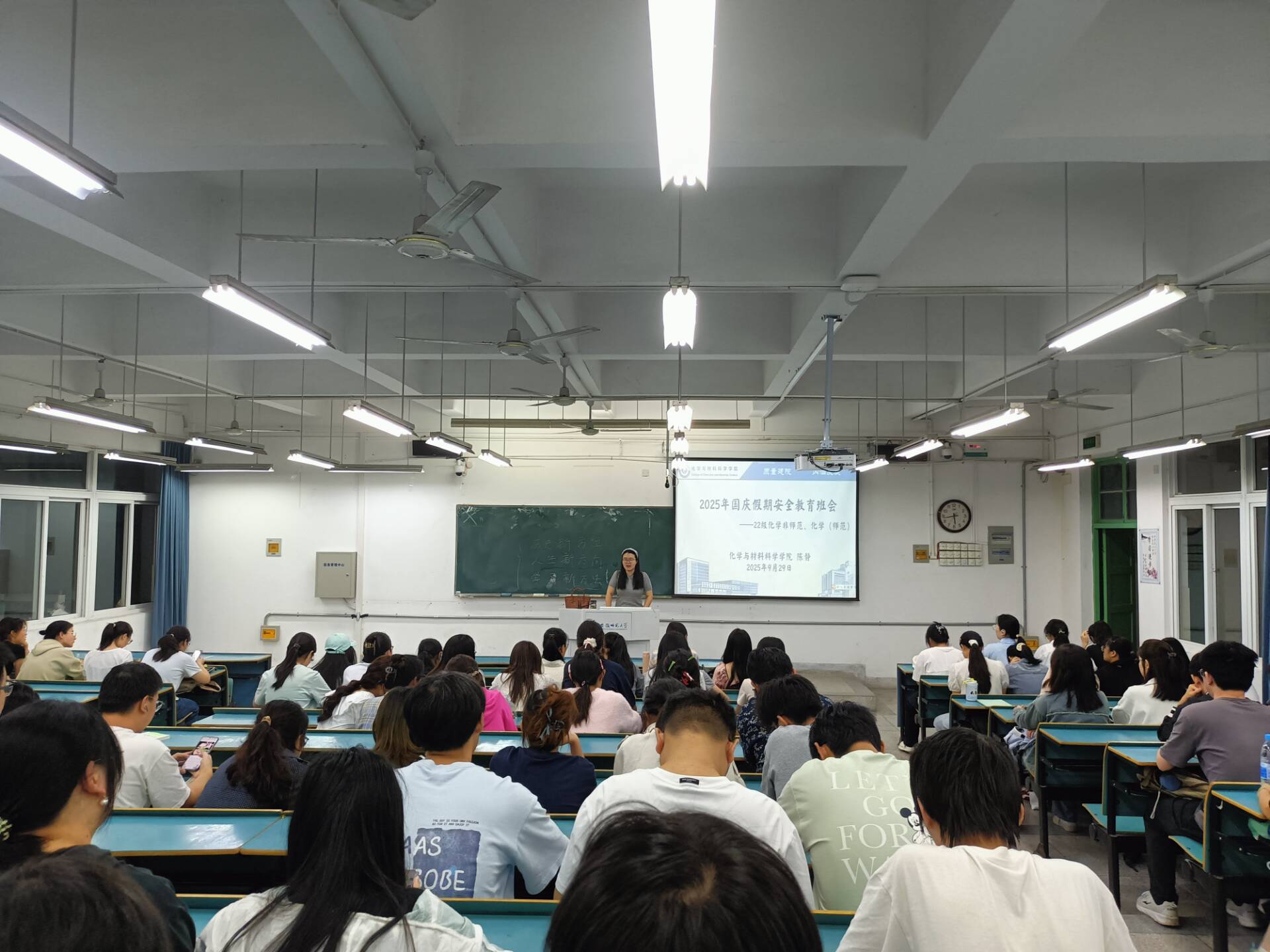 为切实保障员工国庆假期人身财产安全,增强员工安全防范意识,9月29日晚,22级化学师范、非师范专业在2070101教室分批次召开国庆假期安全教育主题班会。本次班会由辅导员陈静主持,专业全体同学参会。