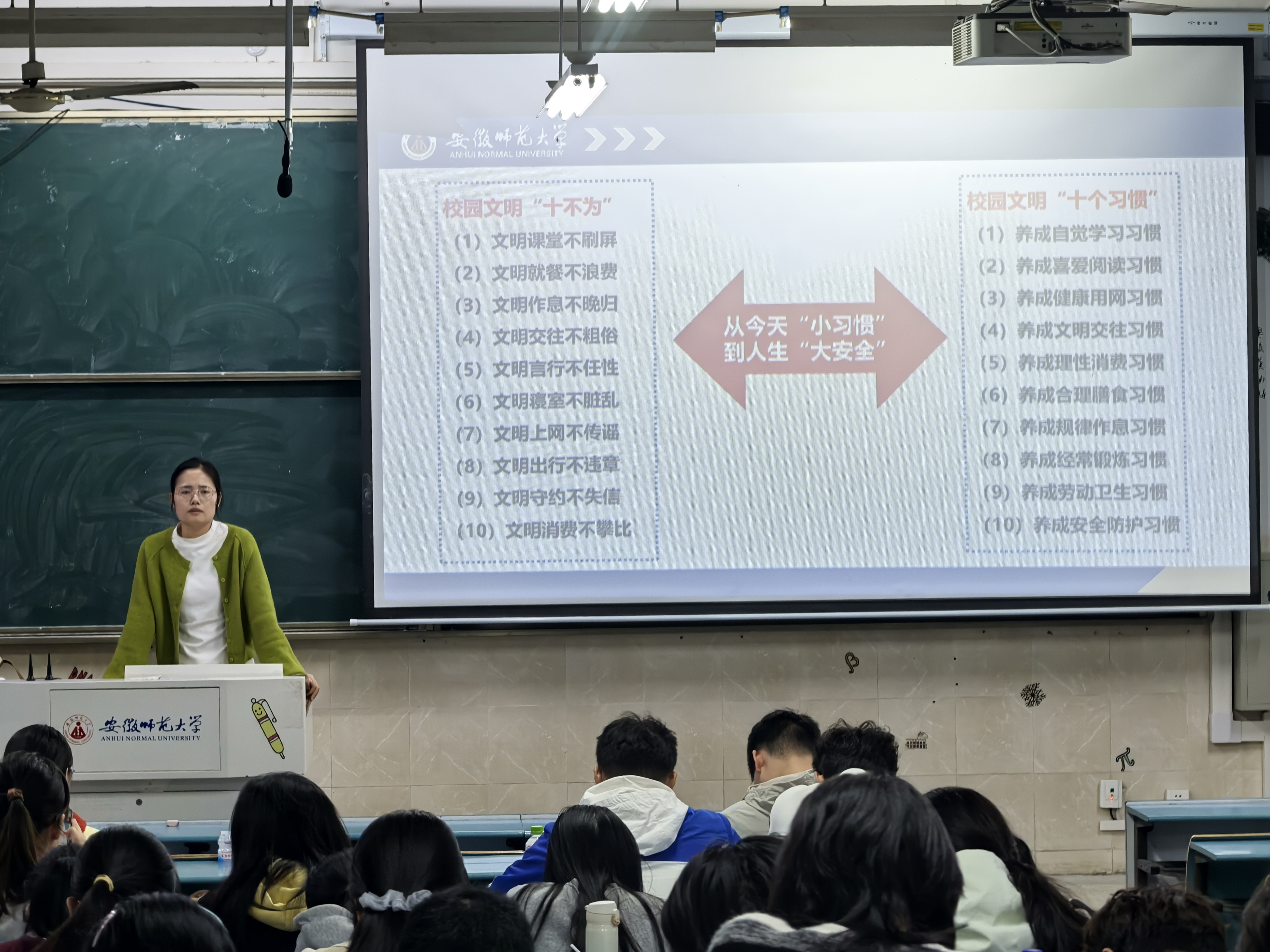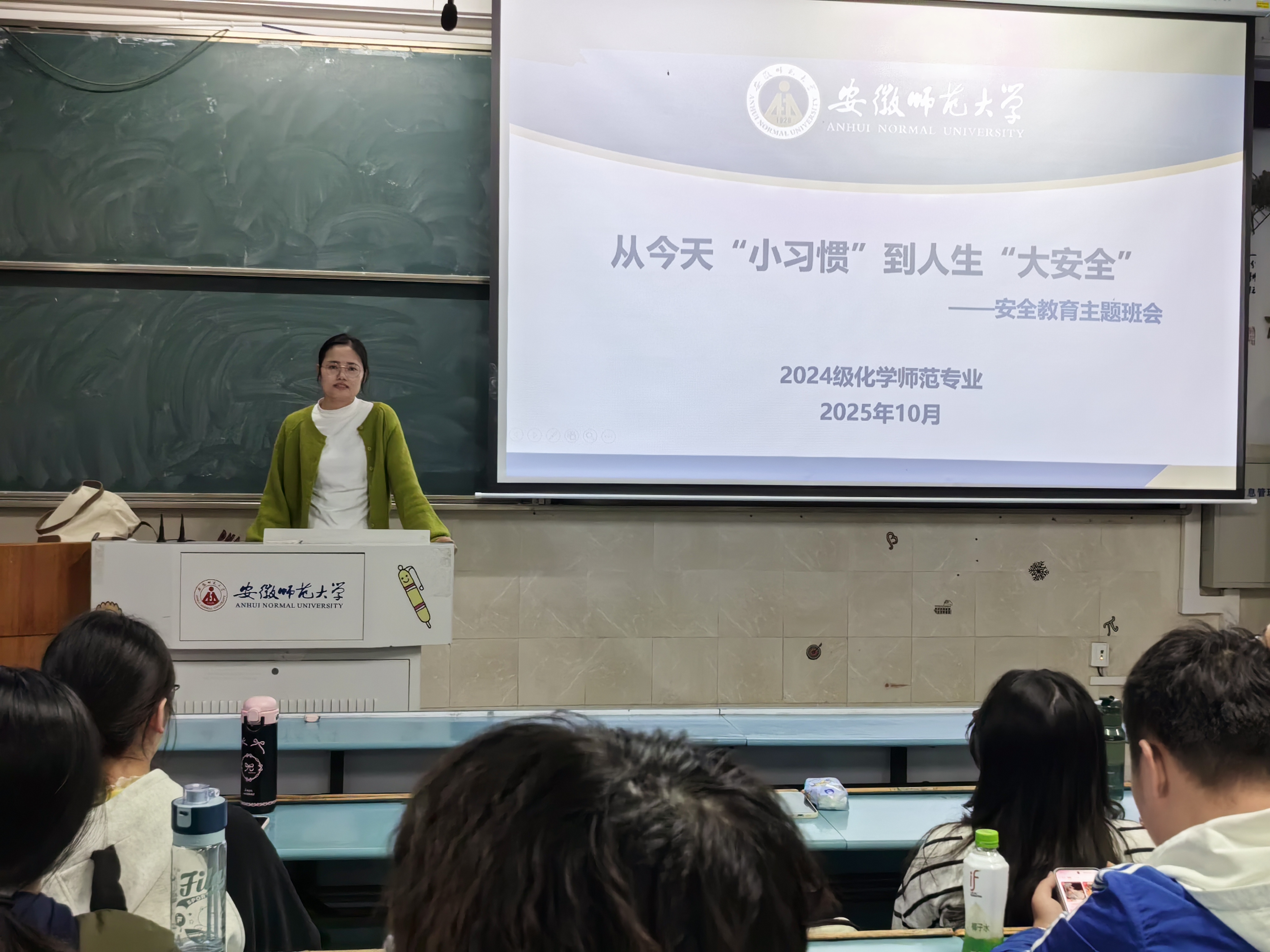 为切实增强员工的安全防范意识与自我保护能力,筑牢校园安全防线,10月28日晚,辅导员杨洋在1号教学楼2010303教室为2024级化学师范专业员工召开了题为“从今天小习惯,到人生大安全”的安全教育主题班会。