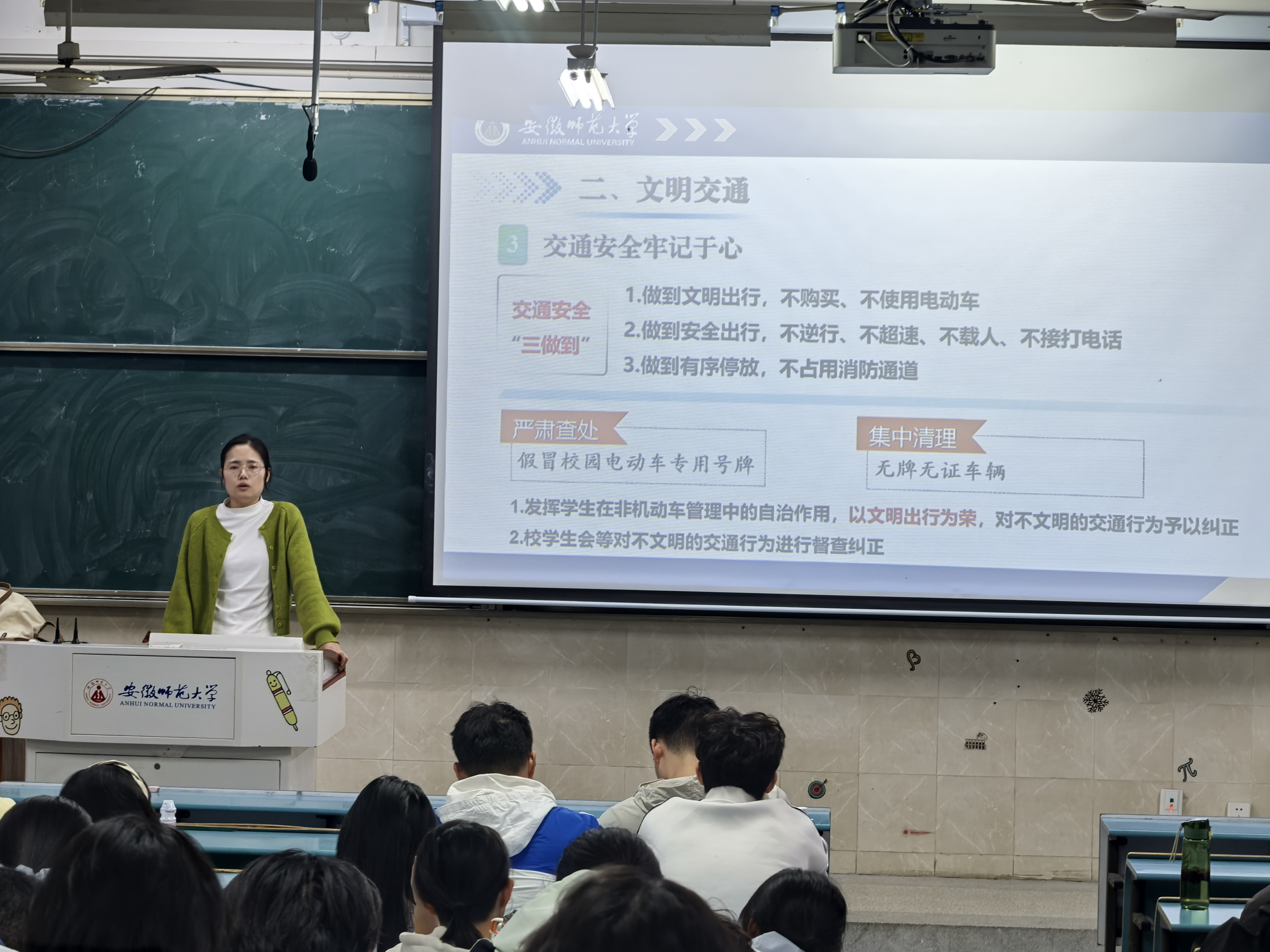 “交通安全”成为班会第二板块的重点。辅导员通过展示校园内发生的交通事故录像、违规载人、车辆随意停放等典型案例,直观揭示了忽视交通规则带来的严重后果。她向同学们发出倡议:在校园内骑行或步行时,务必“安全出行”,严格遵守不逆行、不超速、不载人、不接打电话等基本准则。同时,她特别强调了有序停放车辆的重要性,确保消防通道畅通无阻,为校园安全应急预留生命通道。