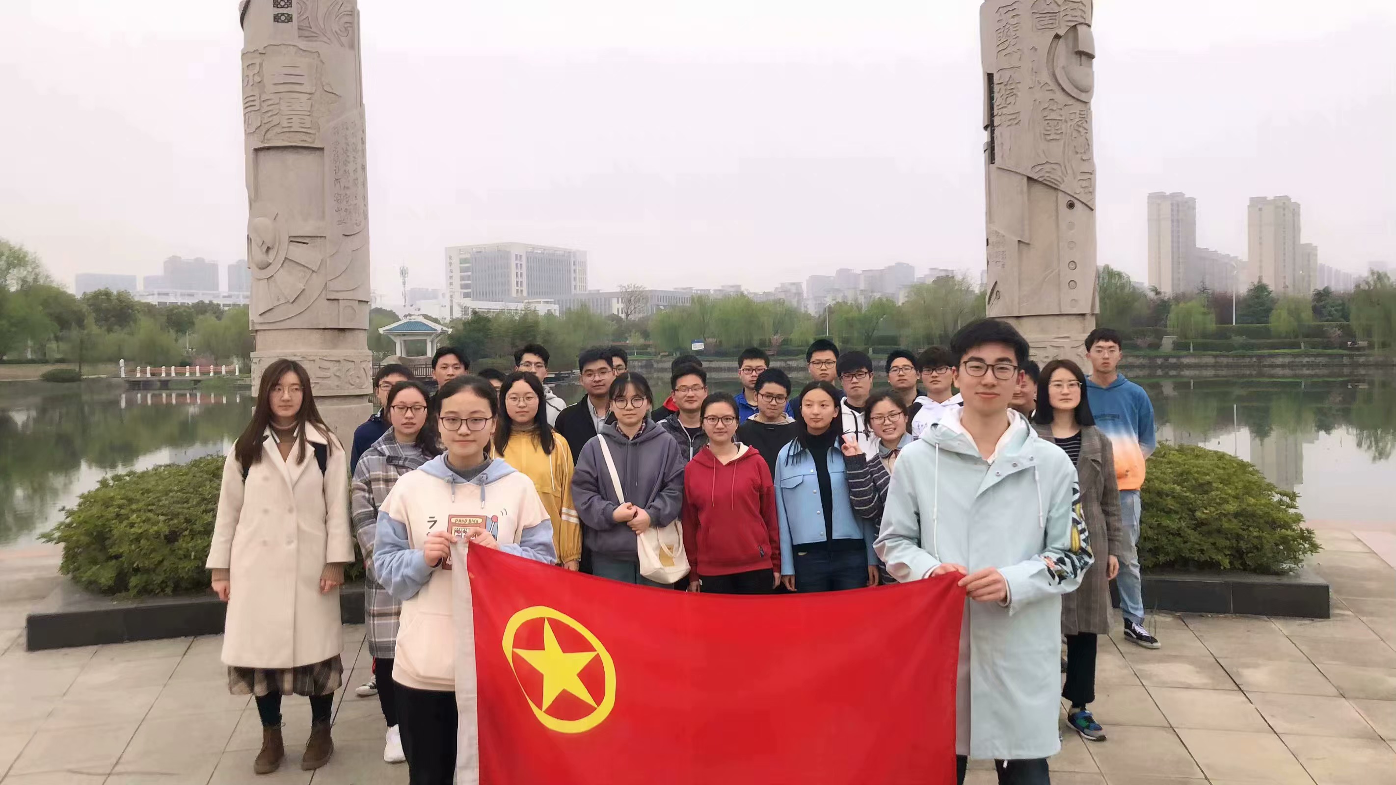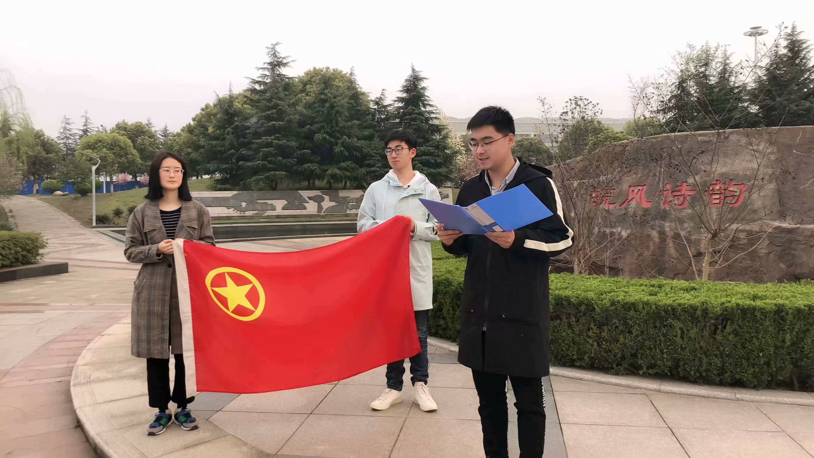 团课过后,我支部又来到校园一角——印有“皖风诗韵”石刻的水边。在夕阳温馨的光辉下,感受春日的气息,开展进一步的探讨。在文娱委员丁子午同学的领唱下,同学们齐唱国歌与团歌,歌声铿锵有力,过程庄严肃穆。之后,在团支书黄宁宁同学的带领下,大家再一次重温入团誓词,时刻提醒自己身为团员的使命与义务。在鲜红的团旗下,金宇同学作为优秀共青团员进行了一场关于五四精神的演讲,与我们分享他眼中的五四精神的内涵,联系自身与班级实际谈论五四精神的当代价值。篇幅不长,却是情真意切,引人深思。