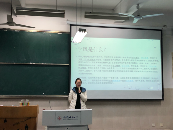 班会就本班半学期以来的学风、整体学习成绩在年级的水平、学习经验交流以及同学之间的互助情况等展开。首先学习委员指出,本班自主学习方面仍需加强,并用具体数据以寝室为单位说明整体成绩所在位置,鼓励同学应该更加努力学习。之后由各寝室代表发言,分享学习方法以及经验,这让在座的同学们受益匪浅。最后,12月四六级大战即将来临,四级备考计划应运而生,鼓励同学们能做最后的考前冲刺。