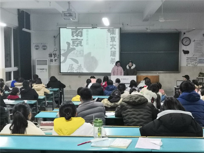 12月7日,是第五个国家公祭日。在这个悲痛的日子里,在化师班级团支书孟凡秋和张莲莲的主持下,化师班级全体同学通过一组PPT了解了悲痛的历史,国耻难忘,家仇难忘,在主题班会的最后,全体同学齐声宣誓,不忘国耻,为中华之崛起而奋斗。