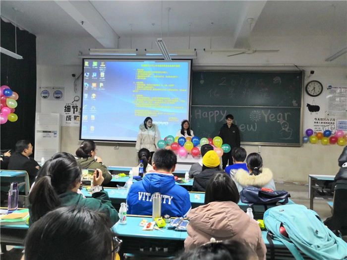 12月23日,为了告别2018,迎接2019,加强班级凝聚力。在全体班委的组织下,化师班级举办了元旦晚会,由副班长刘欣主持,六个节目加上两个小游戏使得晚会气氛异常活跃,一首由辅导员程紫丹演唱的《身体健康》,更是表达了对同学们的新年祝福。晚会的最后,还有班委精心制作的派对蛋糕,蛋糕上有八十片巧克力,每一片巧克力分别写上了化师班级每一位同学的名字以及对他们的祝愿。在合影留念后,元旦晚会圆满结束。