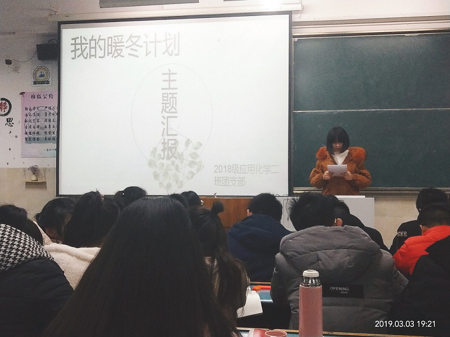 本网讯(18应用化学荣世凡 裴月蓉)为深入学习宣传贯彻习近平新时代中国特色社会主义思想,学习习近平社会主义新理论,2019年3月3日晚,在全国政协十三届二次会议开幕的当晚,2018级应用化学专业全体同学举办了“我的暖冬故事”主题团日分享交流会,全体同学准备了一个寒假的活动于行知楼2010308教室成功举办。