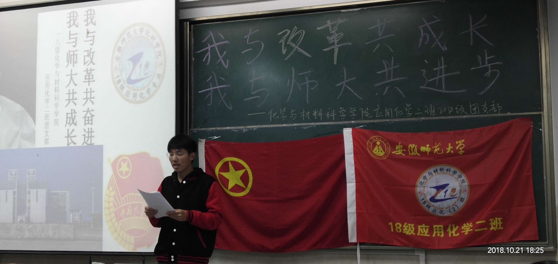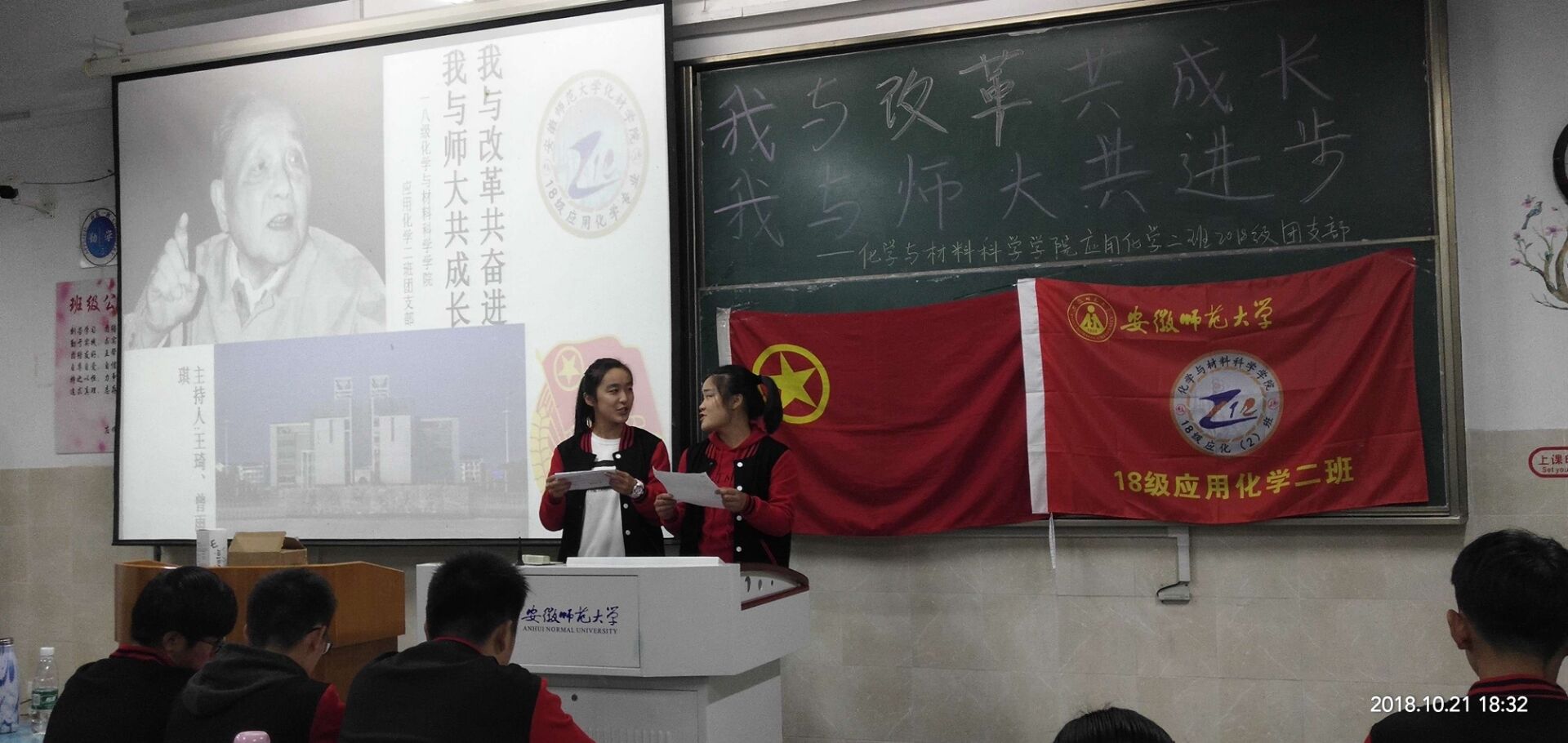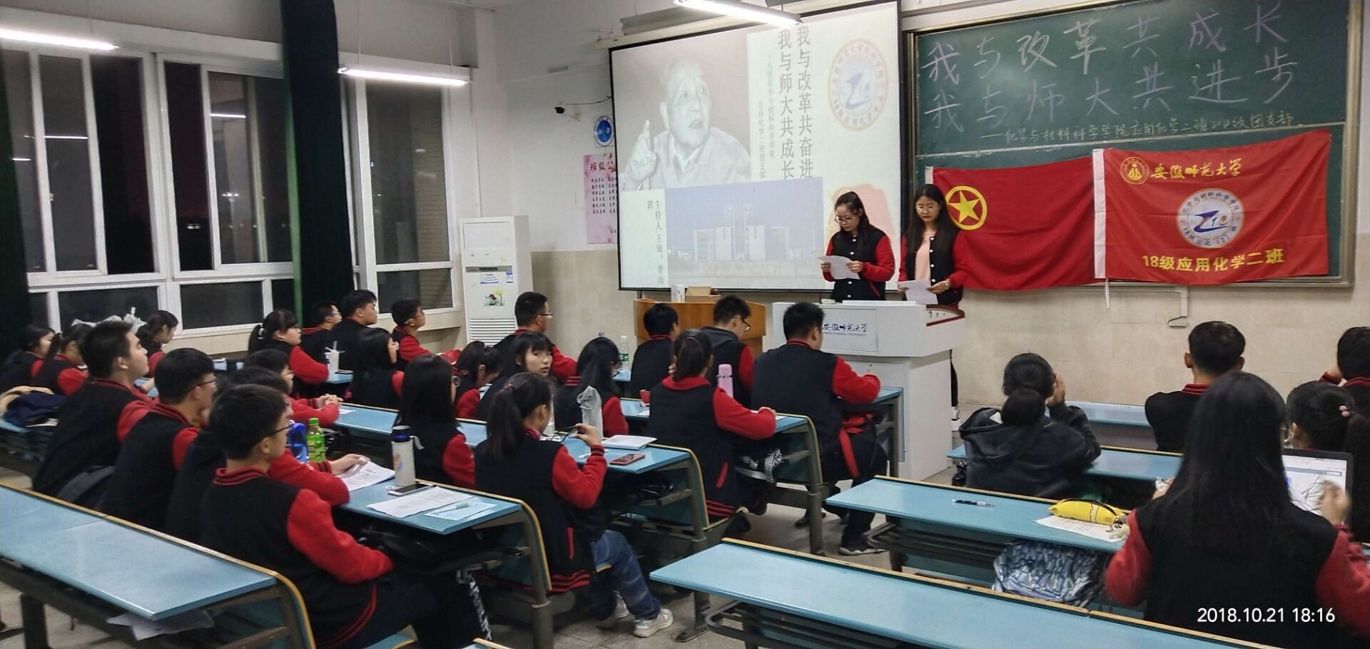 本网讯(应用化学2班 汤楠)2018年10月21日晚6点,18级应用化学2班全体同学在开展了以“我与改革共奋进,我与师大共成长”为主题的团日活动,活动由团支书王琦和认证委员曾雨琪的共同主持。2018年是中国改革开放40周年,40年风雨征程,中国共产党团结带领人民创造了“人类发展史上最激动人心的奇迹”,更实现了从“赶上时代”到“引领时代”的伟大跨越。旨在让当代老员工明白改革的重要性,懂得站在新的历史起点上进一步凝聚改革共识,不断提高自身科学文化素养。