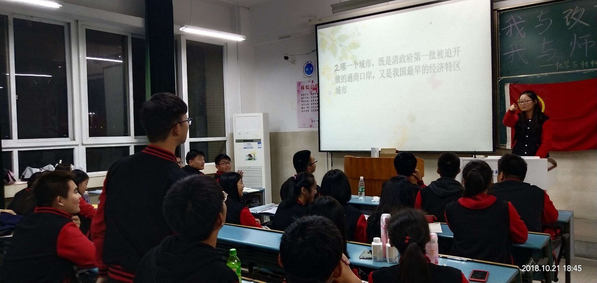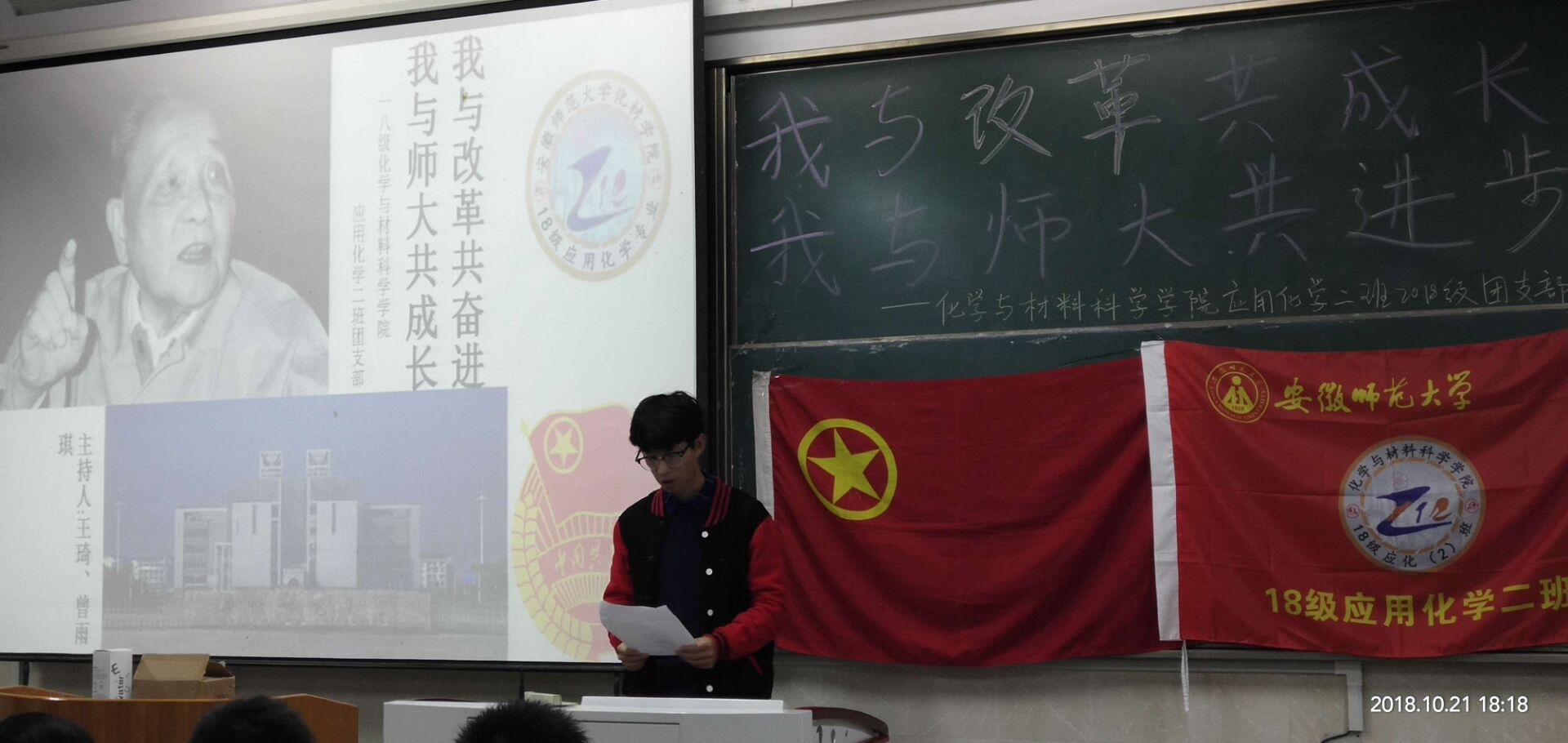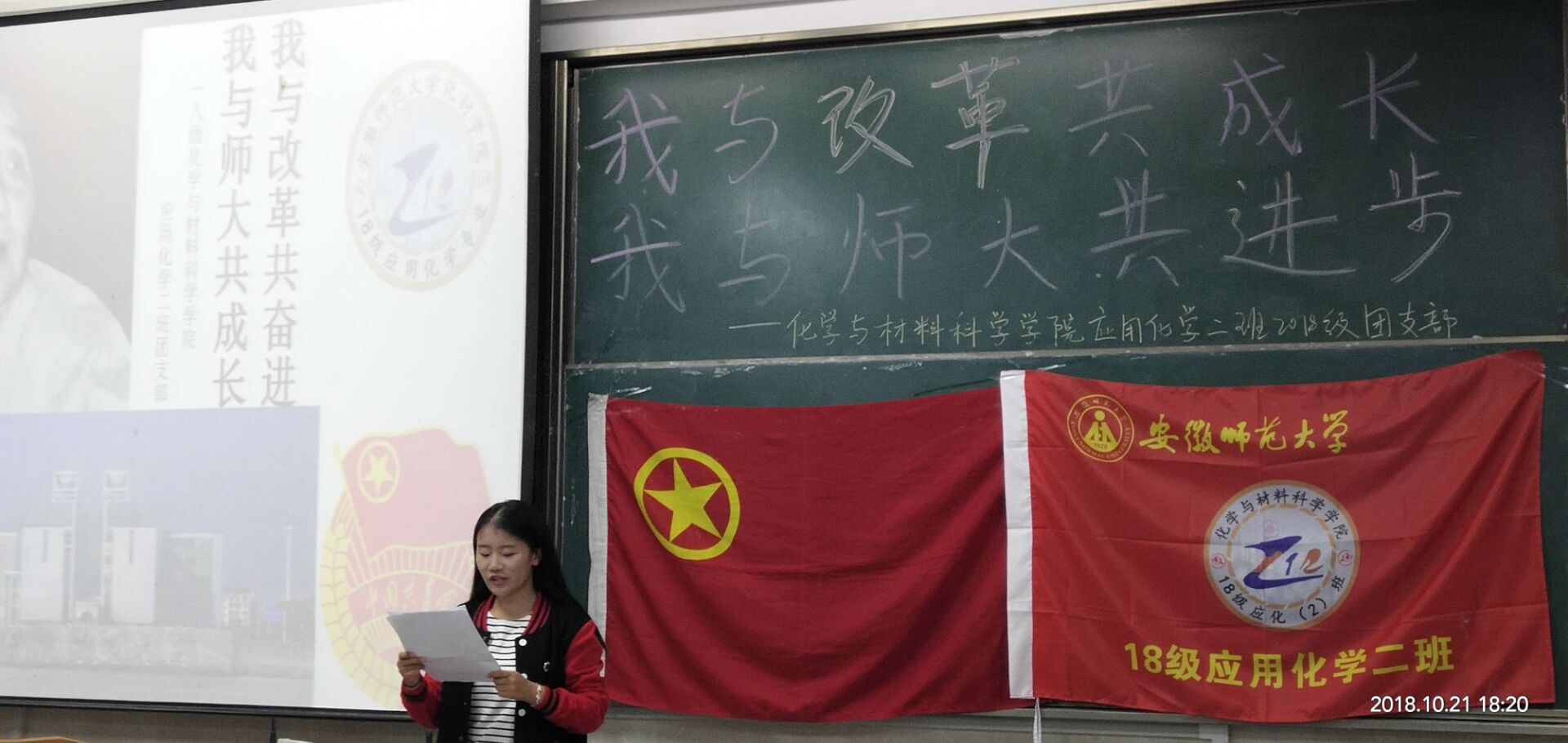 本网讯(应用化学2班 汤楠)2018年10月21日晚6点,18级应用化学2班全体同学在开展了以“我与改革共奋进,我与师大共成长”为主题的团日活动,活动由团支书王琦和认证委员曾雨琪的共同主持。2018年是中国改革开放40周年,40年风雨征程,中国共产党团结带领人民创造了“人类发展史上最激动人心的奇迹”,更实现了从“赶上时代”到“引领时代”的伟大跨越。旨在让当代老员工明白改革的重要性,懂得站在新的历史起点上进一步凝聚改革共识,不断提高自身科学文化素养。