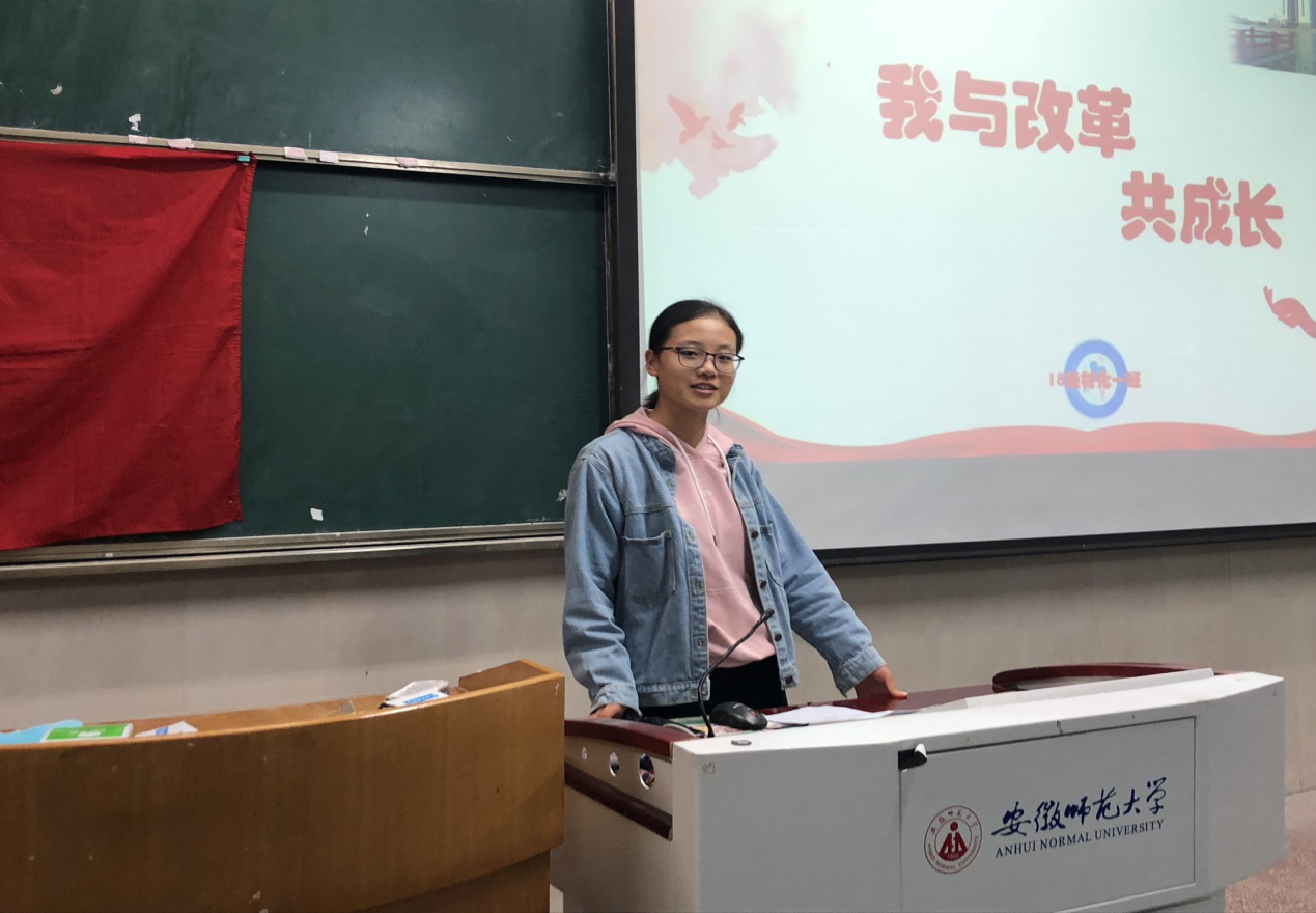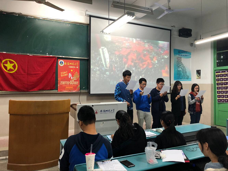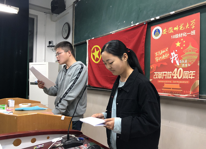 本网讯(18材化1班 程辰)随着十一届三中全会的召开,中国的改革开放拉开了序幕。时光荏苒,见证芳华。到如今, 改革开放已走过40年的风风雨雨。今年正值改革开放40周年,为增进同学们对改革的认识,从而更好地肩负起当代青年的使命,跑好改革的接力赛,10月20日晚上,2018级材料化学一班举办“我与改革共成长”主题团日活动。活动在团支书黄宁宁精心制作的的改革教育片中拉开了序幕。