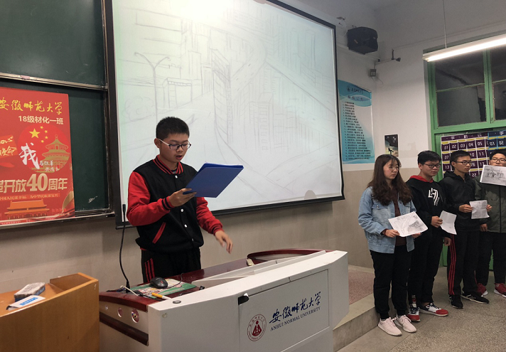 本网讯(18材化1班 程辰)随着十一届三中全会的召开,中国的改革开放拉开了序幕。时光荏苒,见证芳华。到如今, 改革开放已走过40年的风风雨雨。今年正值改革开放40周年,为增进同学们对改革的认识,从而更好地肩负起当代青年的使命,跑好改革的接力赛,10月20日晚上,2018级材料化学一班举办“我与改革共成长”主题团日活动。活动在团支书黄宁宁精心制作的的改革教育片中拉开了序幕。 紧接着由各团小组为同学们带来精彩的演讲。同学们的演讲充分体现他们对改革知识的了解,表现出青年一代坚持学习、开拓视野、为实现既定的改革目标贡献力量的决心。 四十周年,风雨同度。从上世纪70年代到如今的21世纪的10年代。中国发生了翻天覆地的变化。。让我们从不同的角度感受到祖国的翻天覆地的变化。一种我以祖国为荣的自豪感油。生在这个互联互通的新时代,改革不仅关乎国家之盛, 更关乎世界格局,关乎你我,十足地展现了改革开放的重要性。同学们独树一帜,带来绘画作品《以周边之变观改革开放》,团小组b组五位同学创作了五幅不同年代的画作。她们以画笔向同学们绘改革开放,抒爱国之情,得到了同学们的称赞,掌声连连。 有同学声情并茂地朗诵《改革深入我心》,用声音传递“五千年华夏文明,源远流长;四十年改革开放,继往开来”在朗诵中我们一起了解改革。 着优美的歌声,我们的主题班会进入尾声。在小组人员集体智慧下,我们共同改编了《马哲有点甜》在优美动听的歌谣中我们体会改革的影响。 每个人都在思考一个问题:我跟这个时代有什么关系?我有没有辜负这个时代,这个时代有没有辜负我。回答是:这个时代从不辜负人,它只是磨炼我们。00后的我们,没有经历过四十年前的艰苦,但是历史课堂上、历史书籍里、珍存照片中,为我们再现了那个时代的艰辛。如今的美好生活,是无数先辈人艰苦奋斗、奋力拼搏的成果。我们要倍加珍惜现在,学习先辈们艰苦奋斗的精神,接好改革的接力棒, 努力工作,服务社会,脚踏实地,勇往直前,努力奋斗!