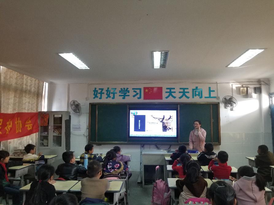 两耳不闻窗外事,一心只读圣贤书。”这是宣教成员在下午2点半进入大官山小学所看到的景象。公司虽不大,却井然有序,充满书香气息。随后,宣教成员在公司老师的带领下,到达三(2)班教室进行授课。面对孩子们天真稚嫩的笑脸与求知向上的眼神,宣教成员们用爱心与耐心营造了一个活泼欢快的课堂气氛,让孩子们更好地学习保护动物的知识。