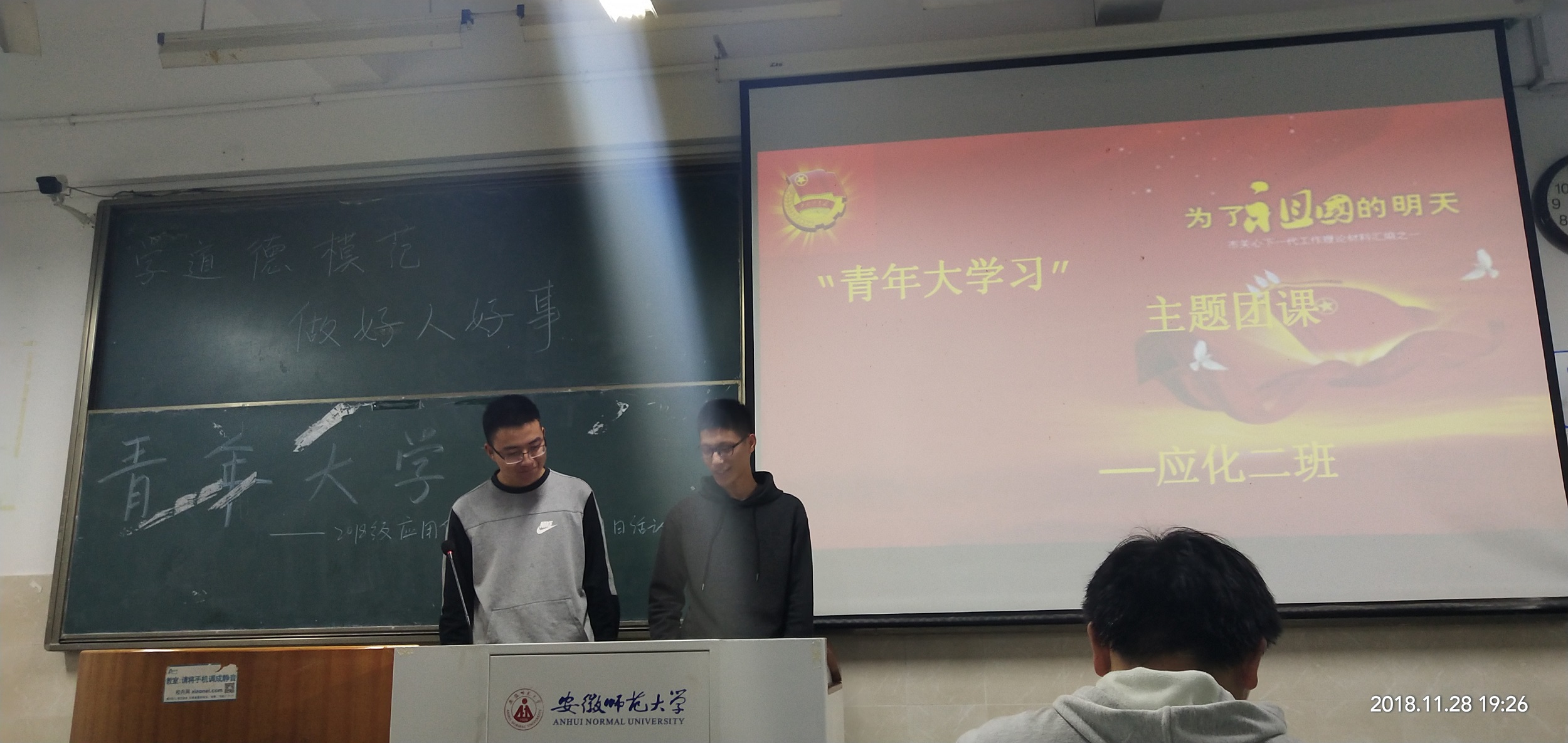 本网讯(18级应用化学王琦)2018年11月28日,团支书王琦向应用化学二班全体同学介绍了校内的道德模范并带领同学们统一进行了"青年大学习"系列的团课学习活动,旨在学习优秀共产党员品质精神、了解党的指导思想与深刻内涵。