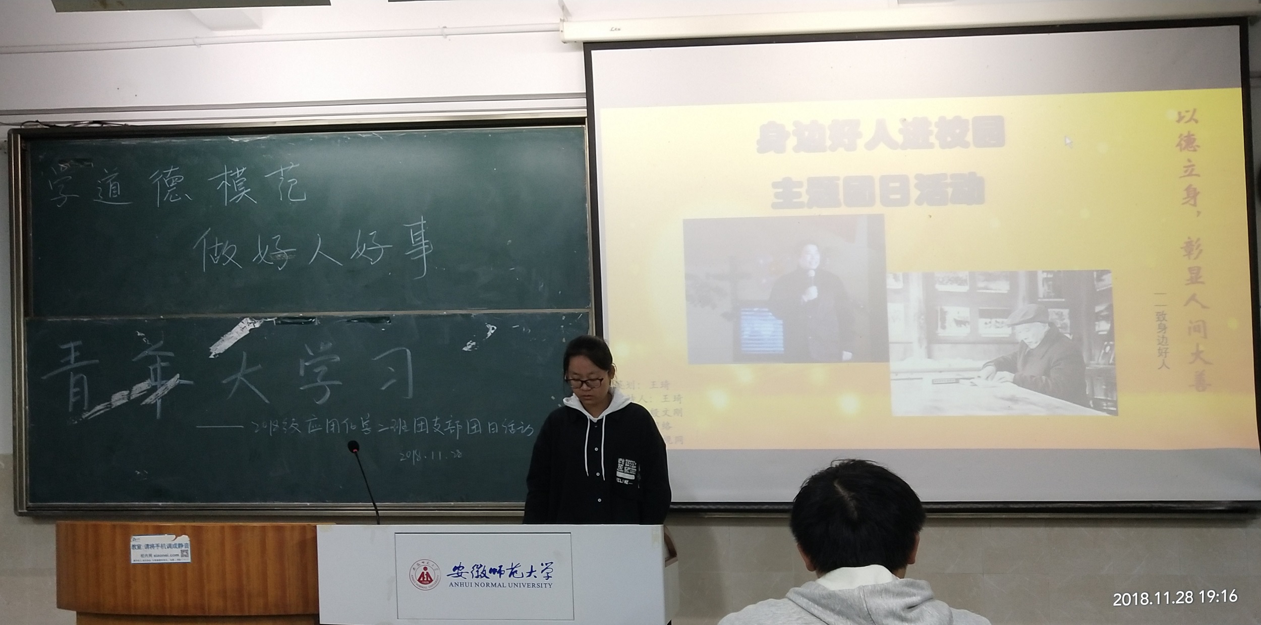 本网讯(18级应用化学王琦)2018年11月28日,团支书王琦向应用化学二班全体同学介绍了校内的道德模范并带领同学们统一进行了"青年大学习"系列的团课学习活动,旨在学习优秀共产党员品质精神、了解党的指导思想与深刻内涵。 团支书王琦列举了两个道德人物,其中一位是师大马克思公司最美思政课教师–路丙辉,二十六年来,“做一个温暖的老师”一直是他的座右铭。用温暖给予锻铸师魂,将思想政治教育工作延伸到无限的为员工服务中去。不仅如此,他还通过第二课堂认识了一批需要帮助、渴求引导、追求梦想的员工。凡是被路丙辉发现的,不管是通过什么渠道认识或了解的,只要是需要帮助的员工,没有一个被放弃,甚至是贫困山区的贫困儿童,都会得到帮助。这令同学们钦佩,多年来,数百名员工受到不同程度的帮助和指导,获得长久发展。 接下来,由第二团小组组长吴思凡及吴吉祥同学向大家介绍了5期青年大学习中的知识,同时说出了他们的真实感受。同学们通过今晚的学习,通过本次团课,使得同学们对共青团组织又有了进一步的了解,同时也勉励每个一位同学在今后的学习生活当中,时刻要以团员的标准要求自己,不断努力,学习道德人物的优良品质,朝着更高的目标去奋斗。