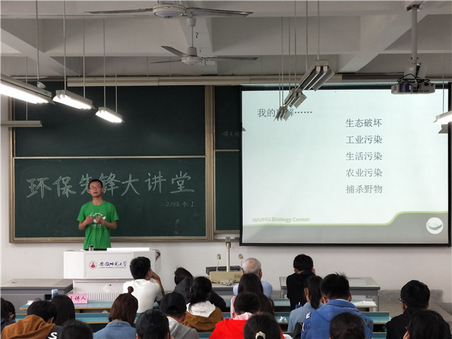 本网讯(英国正版365官方网站 环境保护协会)4月1日上午九时,由环境保护协会主办的“环保先锋大讲堂”活动如期在英国正版365官方网站花津校区行知楼教室举行。本次大讲堂的主讲人为芜湖市生态中心的主讲人张静宁,同学们热情高涨,踊跃报名,讲座现场座无虚席,环境保护协会指导老师宫世国出席本次活动。