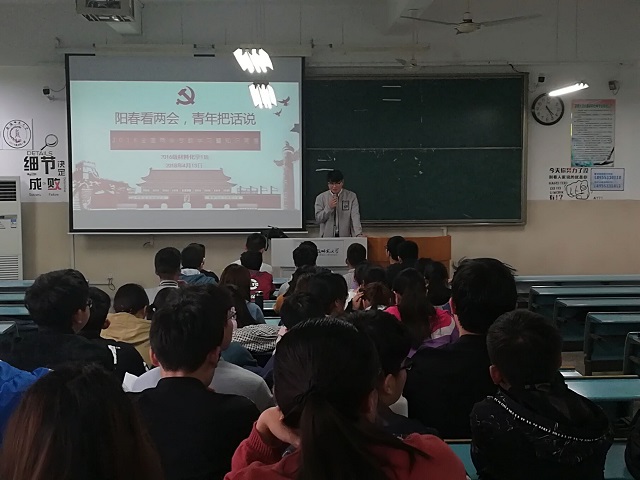 会议伊始,陶老师向同学们强调了本次活动的主题是学习“两会”精神,并简要介绍了今年两会的主要日程安排。接着,他又分别从关键年份、修改宪法、领导人换届、改革开放、经济高质量、监察立法六大关键词带领同学们一起了解了“两会”的重要性。他在台上认真为大家进行讲解,台下的同学们个个都屏气凝神专心致志地听着。随后,陶老师与同学们一起对两会中的热点问题进行了重点讨论,并对往届“两会”网民关注的十大问题以及政府工作报告做了相关了解与分析。研讨过后,陶老师组织同学们开展了一场以“两会”内容为主知识竞赛,通过趣味问答的方式加深同学们对于关键内容的了解。