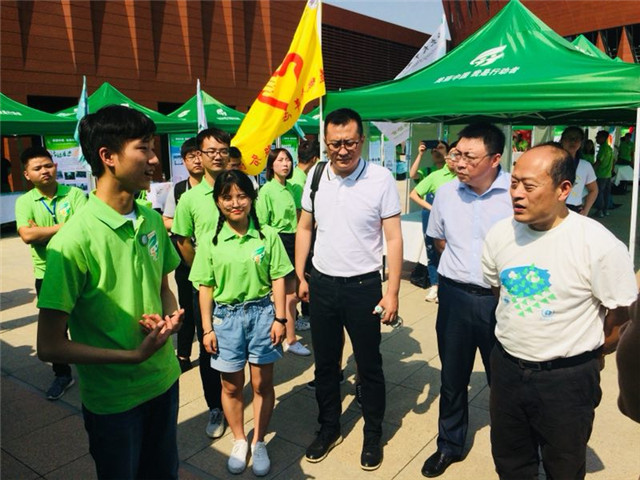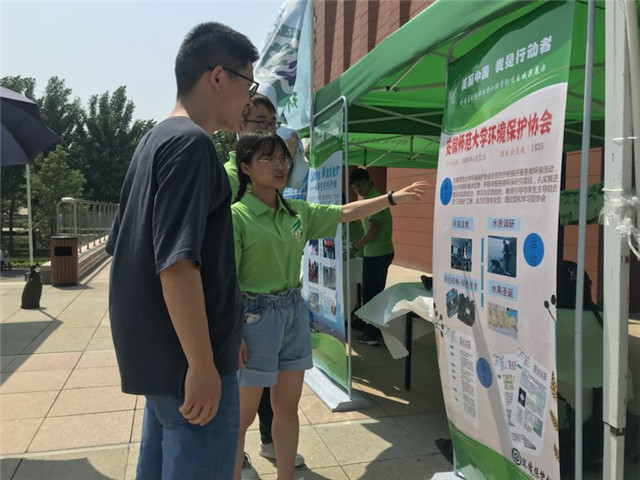 下午1点半,户外展示活动开始。来自全国统一价的近70余所优秀社团代表纷纷积极为参会人员进行社团简介和项目介绍,公司环境保护协会的两名代表也向过往的领导、其他社团代表等简要介绍协会和入围项目,展示了环协的历史发展和优秀事迹。2:40左右,环境保护部宣传教育中心主任贾峰、北京市环境保护局副局长王瑞贤、清华大公司团委书记邴浩等领导嘉宾对本次活动进行参观指导,与员工展开交流,并向员工询问其社团环保活动的具体情况。