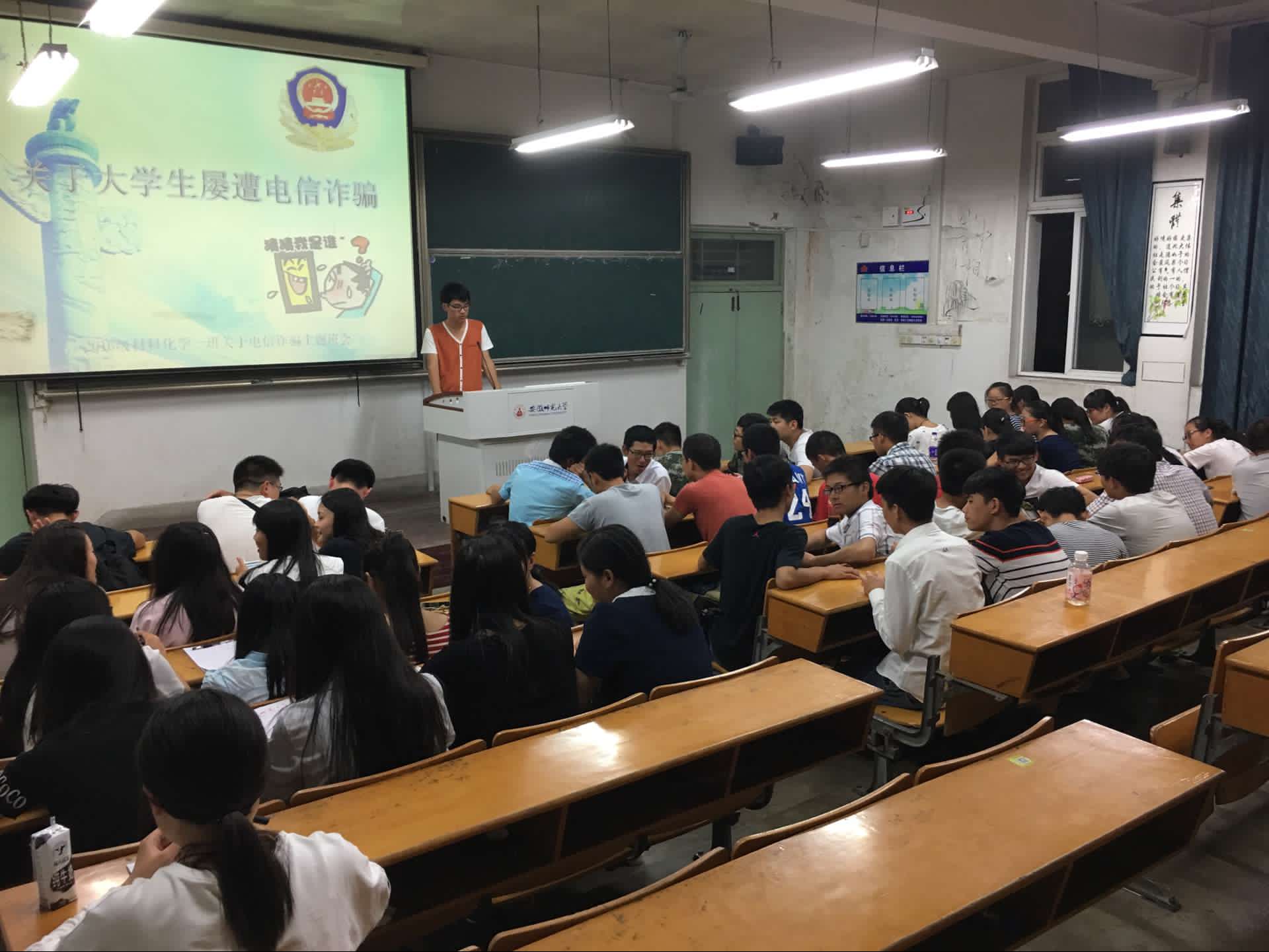 本网讯(英国正版365官方网站团委宣传部 邹雯婷 高倩倩 阮梦洁)为响应公司号召,加强新生的安全防范意识,9月18日19时30分,材化一班的小花菜们在生化楼2043教室举办以“防电信诈骗”为主题的班会。材化一班临时联系人栾润泽担任主持人,小花菜们在会上踊跃发言。