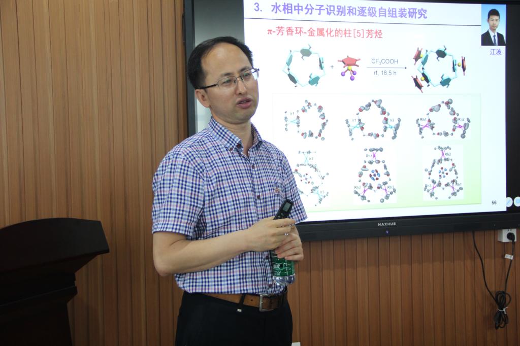 杨海波教授作了题为“复杂体系的精准自组装及功能化”的学术报告。杨教授首先介绍了超分子自组装的基本概念及最新进展,超分子自组装是指组装基元通过分子间非共价键相互作用自发形成有序结构的过程,被认为是在分子以上层次创造新物质和产生新功能的重要手段,已经成为超分子化学研究的核心内容和前沿领域。超分子自组装发展到今天,人们已经不再满足利用单一非共价键相互作用构筑简单的超分子结构,而是思考如何建立和发展多级次、多组分的自组装方法,探索新的可控自组装途径来构筑复杂有序并具有特定功能的超分子体系。杨教授课题组充分利用配位键键能较强、具有明确的方向性、并且与其他弱相互作用力正交等性质,发展了以配位键为核心推动力的逐级自组装策略,并利用这一策略构筑了一系列结构精确且复杂有序的超分子组装体系以及具有刺激-响应性质的功能化超分子组装体系;此外,他们还将这一策略拓展到复杂超分子拓扑结构的构筑中,实现了高代数、以轮烷作为重复单元的轮烷树枝状分子的高效构筑。杨教授的报告引起了在场师生的广泛兴趣与好评。