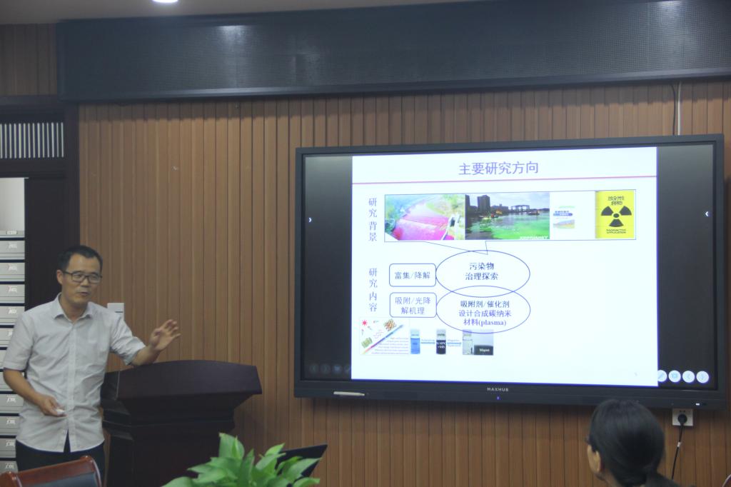 李家星教授作了题为“碳纳米材料去除污染物及其环境效应研究”的学术报告。李教授主要讲述了在应用低温等离子体改性材料方面取得的系列进展,基于对等离子体改性材料的研究,应用低温等离子体方法成功设计合成了氨基功能化的鱗片石墨材料,实现对U(VI)的高效富集。低温等离子体方法在改性材料方面具有许多优势,如环境友好处理材料方便、不会产生二次污染。而鳞片石墨作为最稳定的碳同素异构体之一,不仅来源广泛而且比表面积大,具有独特的“三明治”结构。应用低温等离子体方法将氨基修饰到鳞片石墨上,实现对U(VI)的高效富集。此外,随着对鳞片石墨等离子体处理的时间越长,氨基功能化的鳞片石墨对U(VI)的富集效果越好。原因在于随着等离子体处理时间的增加,鳞片石墨表面的氨基数目以及活性位点均会相应增加,从而实现对U(VI)的高效富集。该方法具有成本低、效率高、环境友好等优势,在水污染处理领域具有广阔的应用前景。李教授的精彩报告不仅拓展了员工的专业知识,还开阔了同学们的视野。