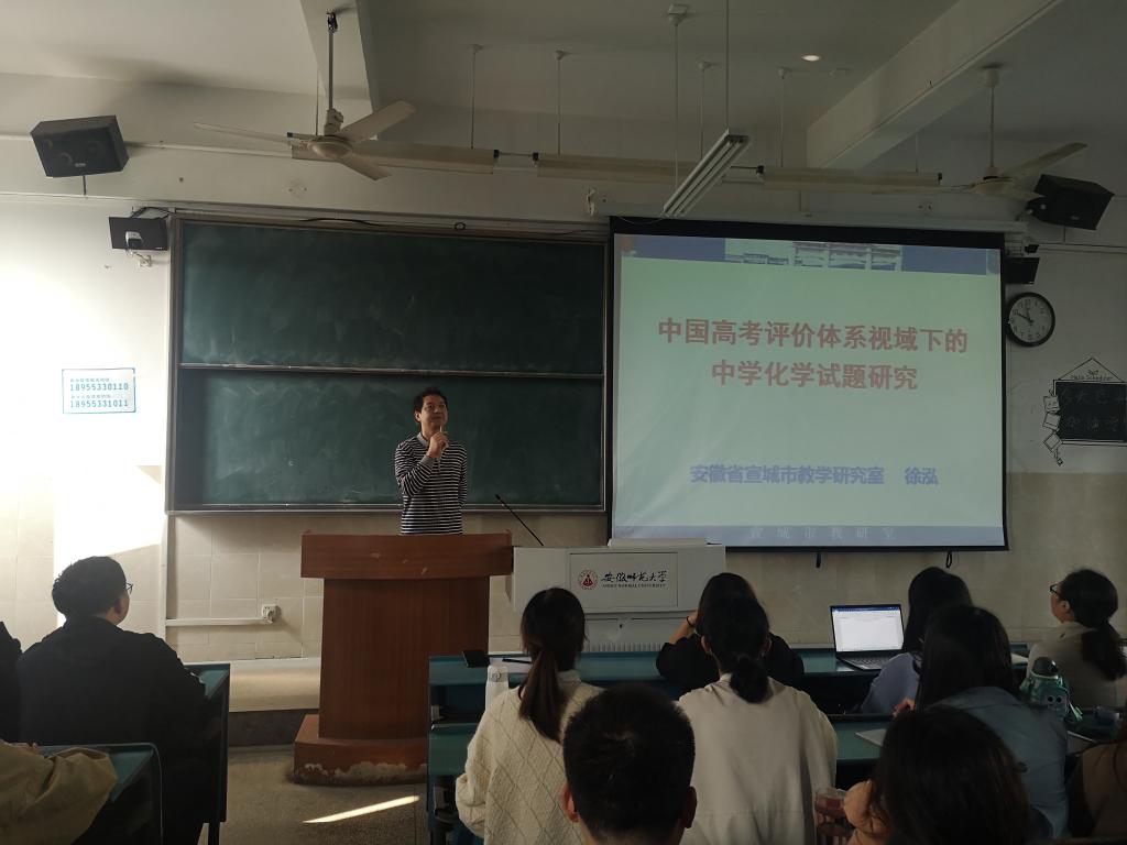 教育评价事关教育发展方向,高考评价体系是高考命题、评价与改革的理论基础和实践指南。2020年11月2日上午9:50英国正版365官方网站英国正版365官方网站邀请安徽省宣城市教学研究室化学教研员、正高级特级教师徐泓作题为《中国高考评价体系视域下的中学化学试题研究》的专题报告,这是2020年“中学化学名师讲坛”系列活动的第七讲。报告会在花津校区1号教学楼多媒体教室举行。2018级化学专业师范生、化学教学论专业研究生及部分化学教学论专业教师共一百三十余人参加了此次报告。