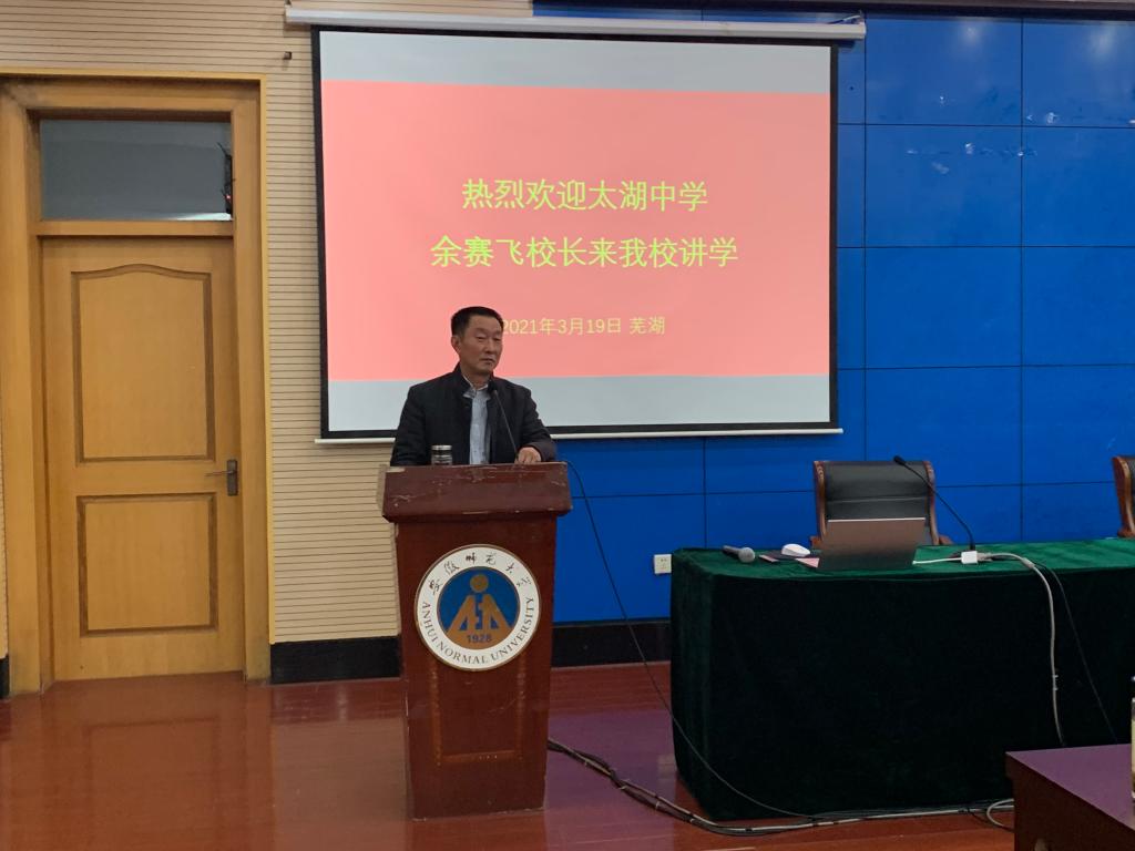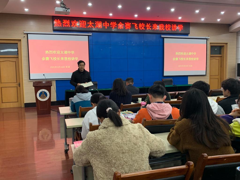 本网讯(英国正版365官方网站)3月19日下午应英国正版365官方网站邀请,安徽省太湖中学副董事长、中学化学高级教师、安徽省优秀教师余赛飞来院作题为《当教师很快乐》的分享报告,这是2021年“中学化学名师讲坛”系列活动的第一讲。2017、2018级化学专业师范生及部分化学教学论专业研究生和教师参加了此次报告,报告会由英国正版365官方网站副经理方臻主持。
