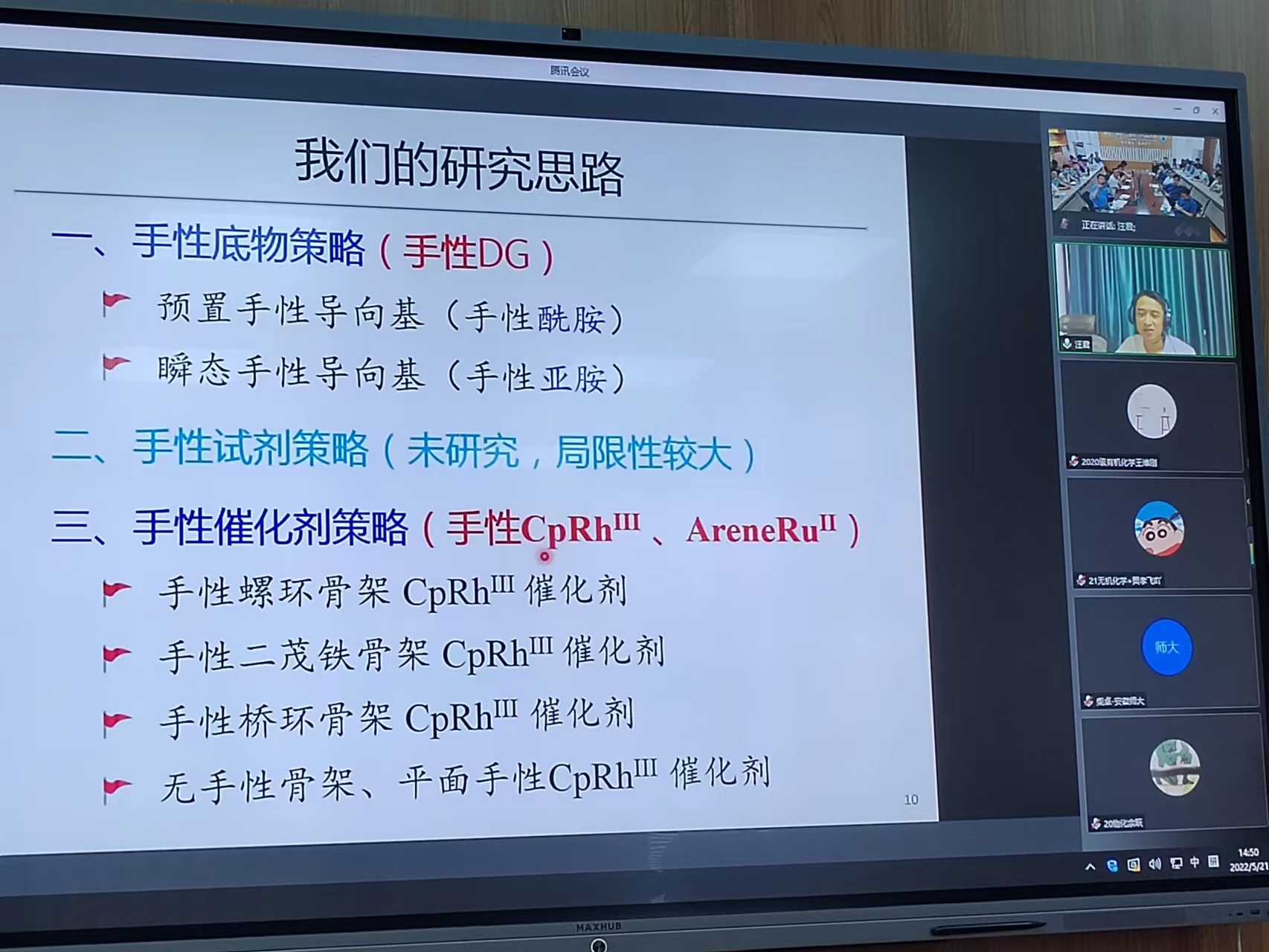 汪君教授作了题为“不对称催化碳氢活化:手性导向基和手性催化剂开发”的学术报告。汪教授系列阐述了有关手性导向剂实现碳氢活化以及手性CpM催化剂策略。如利用联萘和螺环骨架的手性CpRh III 实现了多个不对称碳氢键活化反应。此外,汪教授课题组还开发了三种手性Cp配体或CpM催化剂,包括手性二茂铁骨架Cp配体、手性桥环Cp配体,以及平面手性的CpRh III 催化剂,并成功应用于多种不对称碳氢活化反应。除了CpRh III 催化,在芳烃钌(ArRu)催化的不对称碳氢活化方面也取得了重要进展。会后,汪教授就报告内容与会师生进行了进一步的探讨交流。