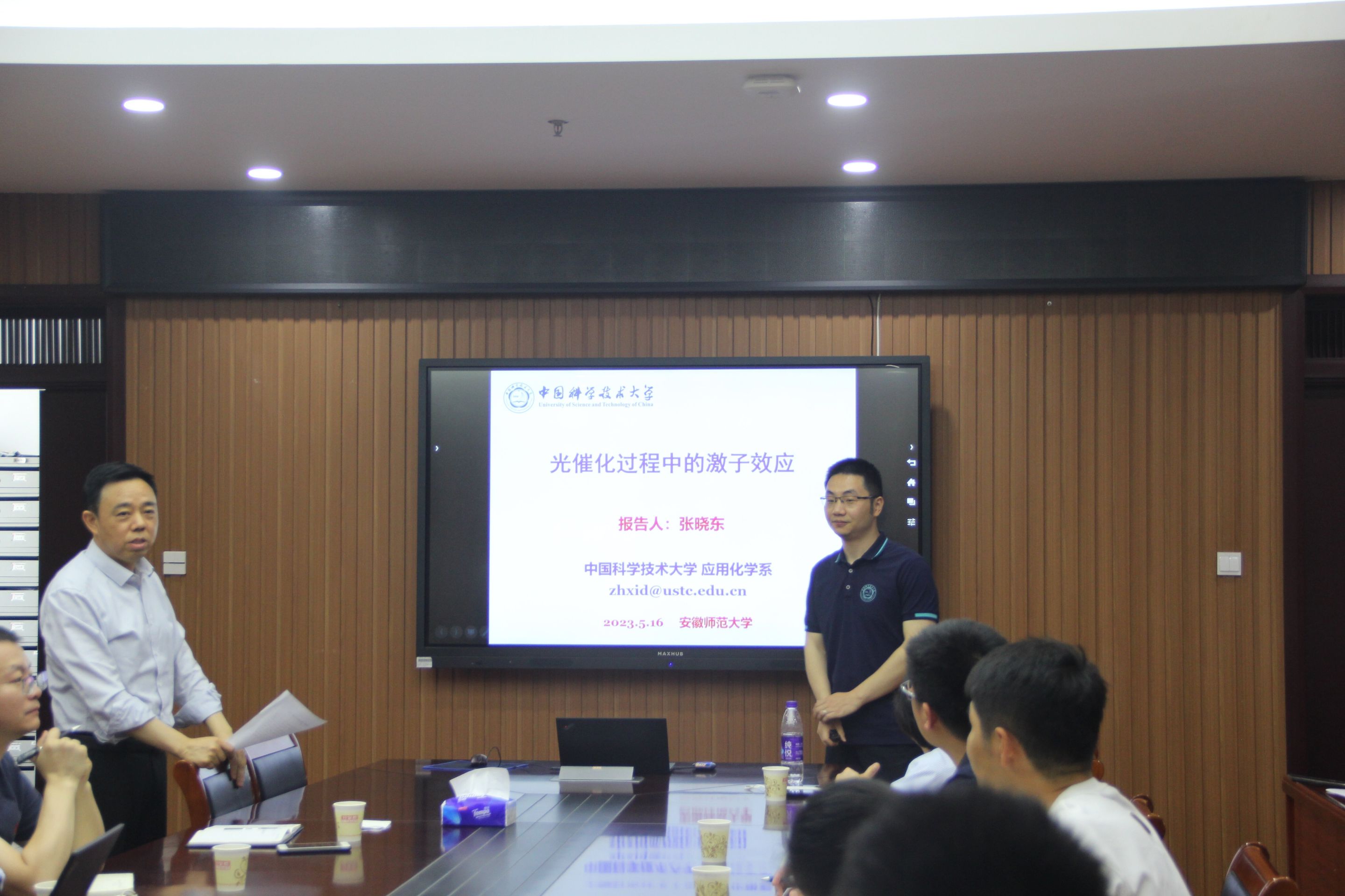 张晓东教授作来题为“光催化过程中的激子效应”的学术报告。张教授阐述了光催化过程的意义,每年地球上的太阳辐射总量约为全球一次能源消耗总量的一万倍。因此,高效人工光合作用的实现对解决危机和环境污染问题具有重要意义。随后张教授介绍了激子的定义:由库仑力结合形成的电中性电子——空穴束缚对;可通过导带中的电子和价带中空穴的相互吸引或由光激发直接产生。最后张教授讲解了通过构建长寿命电荷转移激子态用于传能反应。较弱的旋轨耦合(SOC)和较低的系间窜越(ISC)效率导致聚合物氮化碳体系往往呈现出较低的长寿命激发态产率。会后,张教授就报告内容回答了与会师生提出的问题。