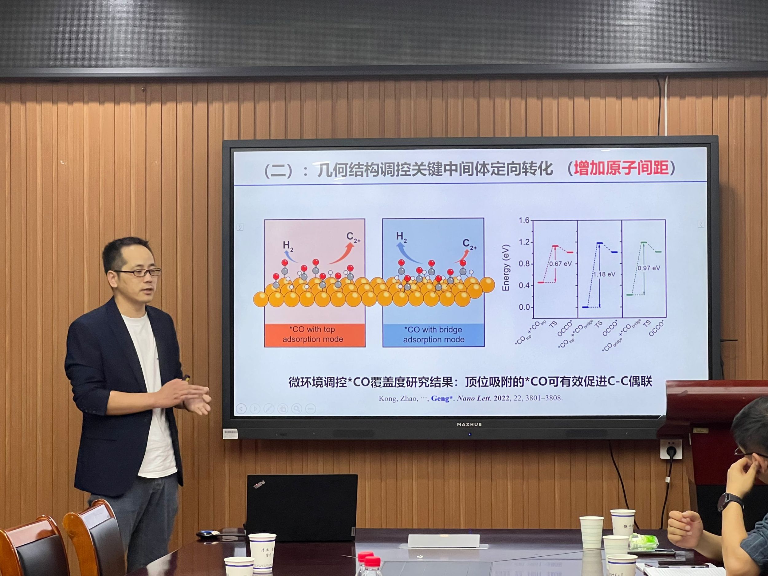 耿志刚教授作了题为“小分子电催化转化高效催化剂设计”的学术报告。耿教授首先讲解了在催化剂表面可以通过电子富集、能级结构和电子自旋态等电子结构调控策略对CO2以及N2起到高效活化的促进作用。随后阐明了活性中心原子间距、动态结构演变等几何结构对关键中间体定向转化的作用机制。会后,耿志刚教授与与会师生展开了一系列学术讨论,并回答了与会师生提出的问题。