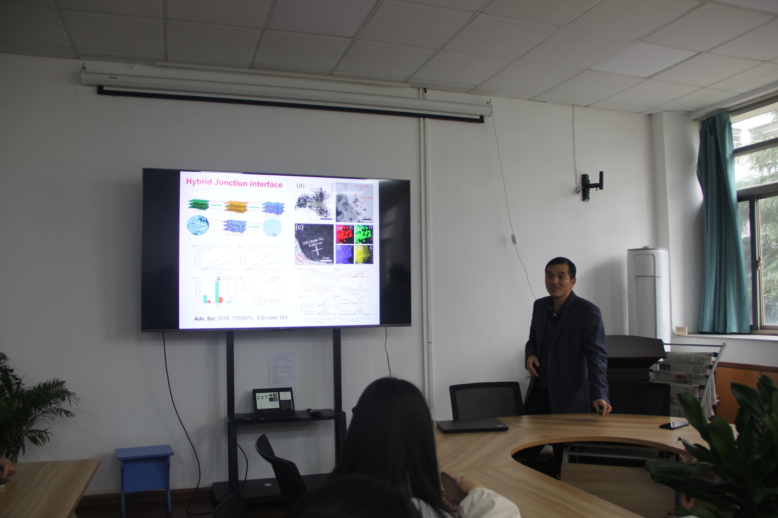 郭晓辉教授作了题为“低维纳米材料的结构调控及电催化应用”的学术报告。郭教授以电催化在“双碳”背景下的广阔应用前景为切入点,就低维纳米催化材料绿色能源开发的合成作用,提高低维材料催化活性进行性能调控,如何提高材料的催化效率以及结构设计等进行详细阐述。同时指出目前商业化催化剂具有较高的活性,并介绍所在团队开发了多种低维非贵金属的催化剂纳米结构材料,通过材料结构的理论设计,调控表界面微观结构及缺陷特性,实现了催化性能的有效调剂,使催化活性接近或高于商业化催化剂水平,为实现低维非金属的催化剂纳米结构材料产业化应用提供了可能。会后,郭晓辉教授回答了参会师生提出的问题。