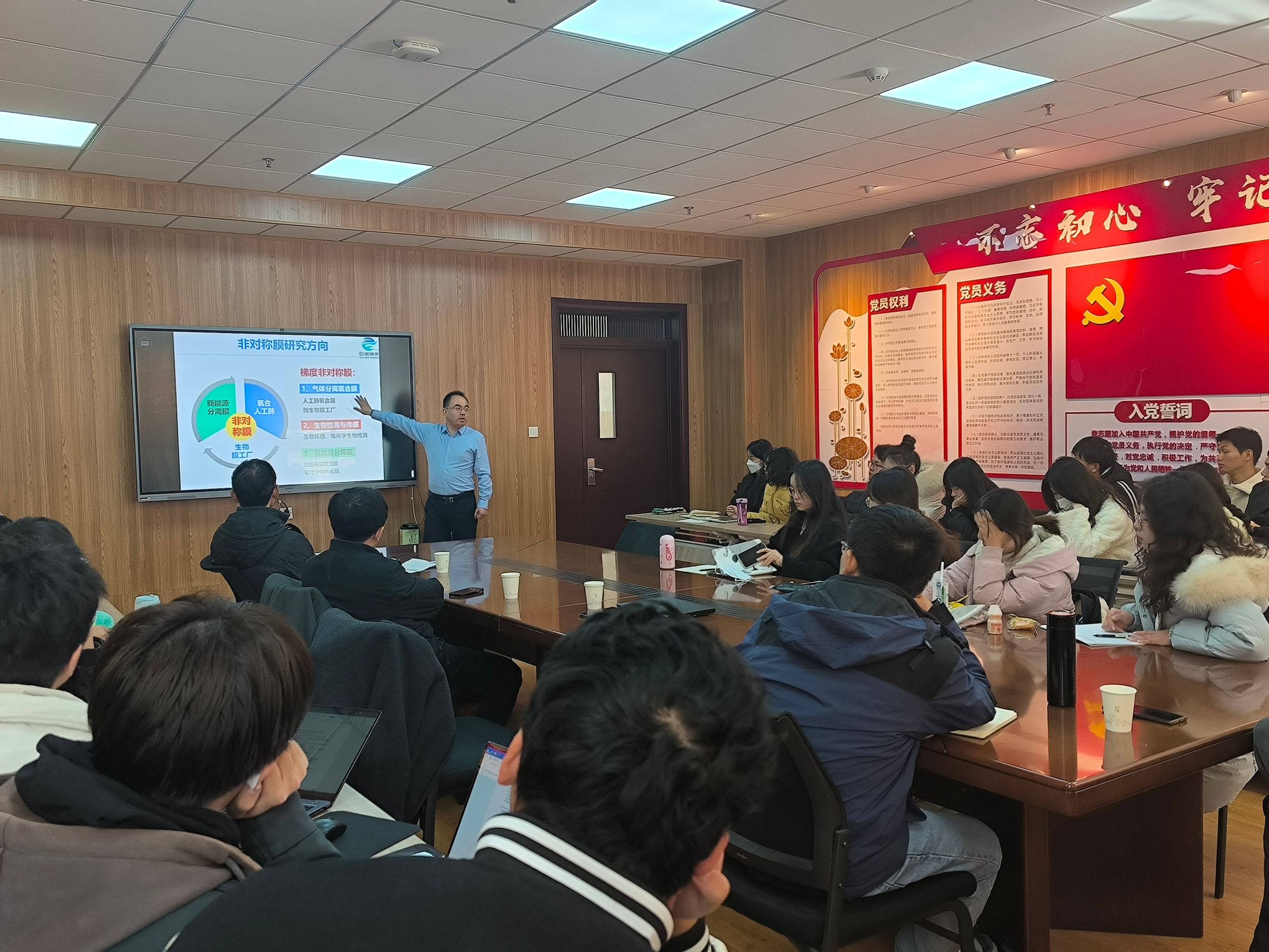 黄小军教授作了题为“非对称梯度微结构氧合膜的构建及其产业化应用”的学术报告。黄教授首先讲解了非对称膜的研究方向,分为气体分离氧合膜、用于生物检测与传感的膜、新能源分离膜三类。随后黄教授讲解了研究ECMO氧合膜的关键科学问题,包括膜微孔结构与血气交换、防血漏性能之间的构效关系以及膜表面性质与血气交换效率、抗血栓性能内在调控机制。接下来,黄小军教授讲解了氧合膜“微孔重构”,亲/疏水非对称氧合膜“表面重构”以及ECMO氧合膜及插管在动物中的临床试验。最后黄教授介绍了非对称氧合膜产业拓展应用、梯度膜产业转化、新型分离膜与产业技术储备和其他新型分离膜产业技术。会后,黄小军教授与参会师生展开了一系列学术讨论,并回答了参会师生提出的问题。