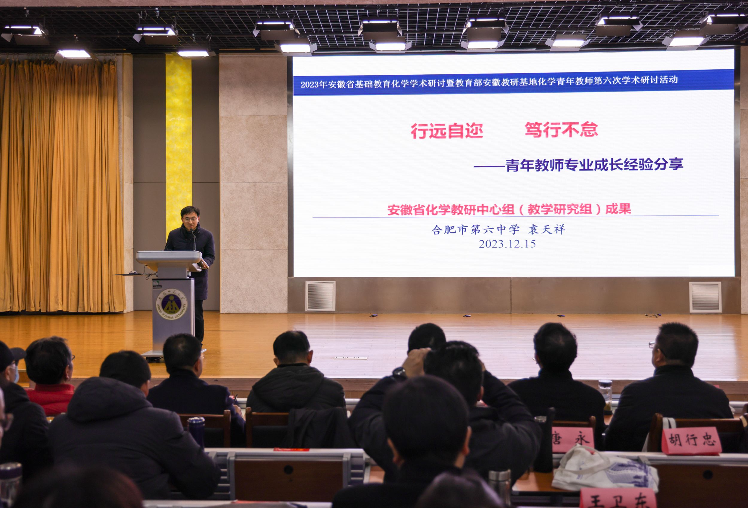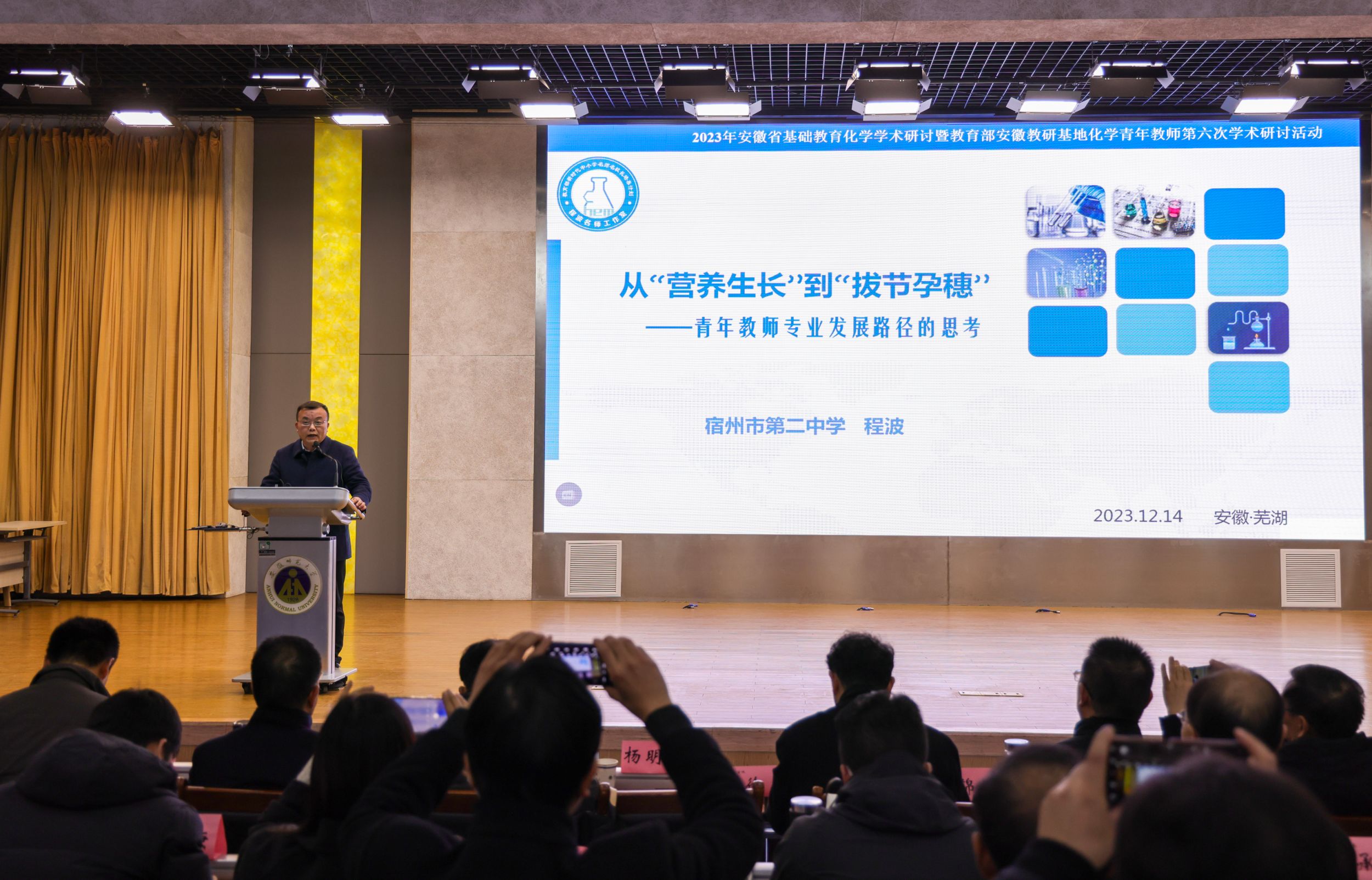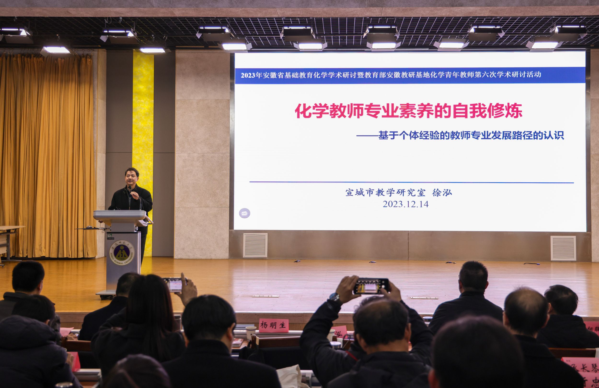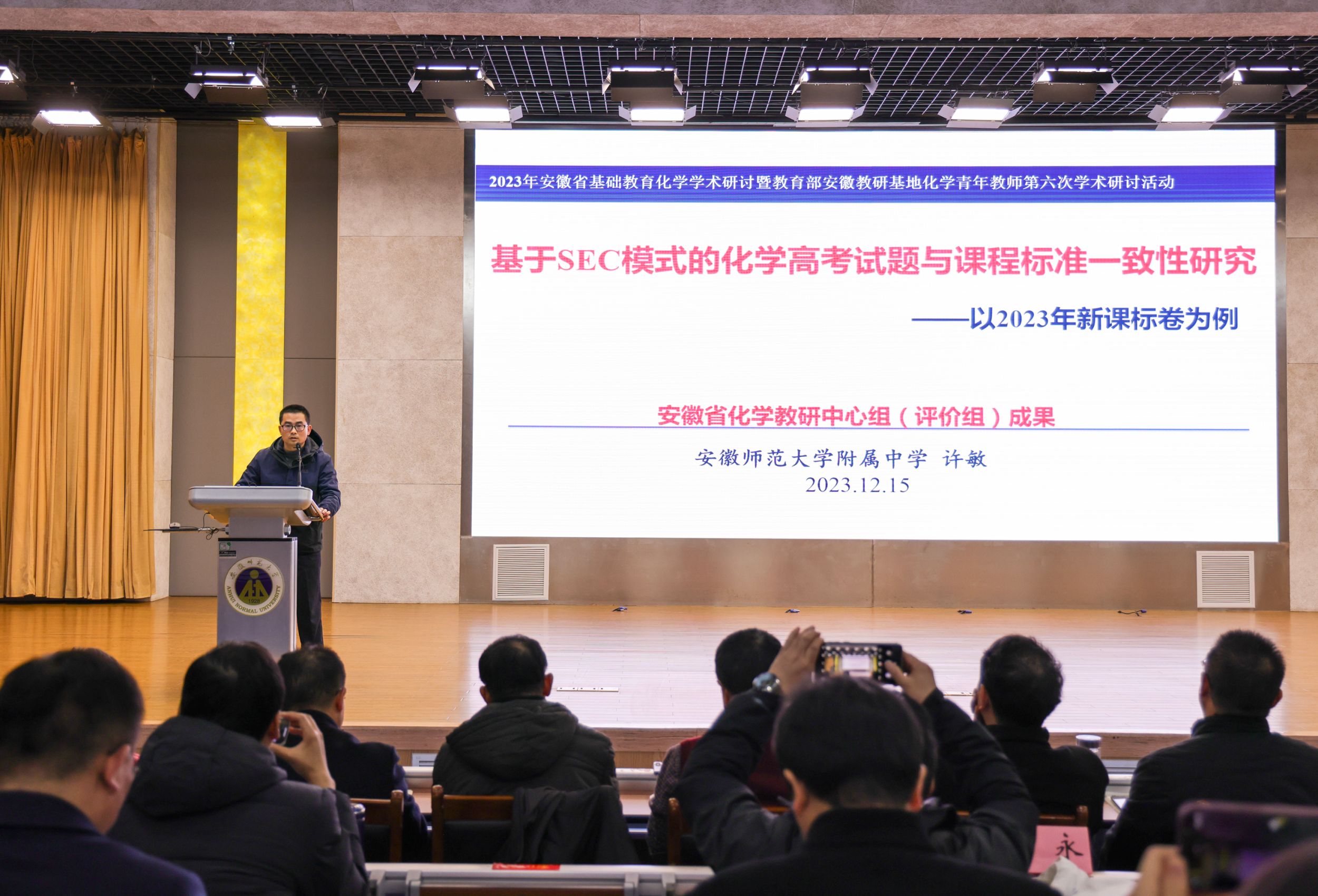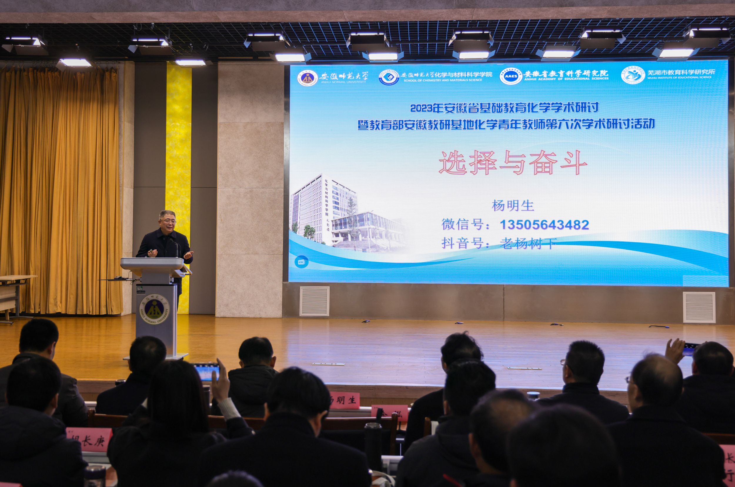 本网讯(英国正版365官方网站 胡欣睿)12月14-15日,“2023年安徽省基础教育化学学术研讨暨教育部安徽教研基地化学青年教师第六次学术研讨活动”在公司理科大楼报告厅举行。安徽省教育科学研究院朱成东老师主持开幕式,英国正版365官方网站教务处处长崔光磊教授、芜湖市教育科学研究所吴长义老师、英国正版365官方网站教学副经理方臻教授出席会议并讲话。中国科学技术大学宋礼教授、南京师范大学任红艳教授、澳门大学魏冰教授和来自安徽省各市、县(区)化学教研员、各市化学正高级教师、特级教师、名师工作室主持人、各市推荐的中学化学青年教师学术研讨中心组成员、安徽教研基地(化学)各实验公司代表以及化学教学论研究生、化学专业师范生参加会议。会议规模盛大,名师云集。本次活动由安徽省教育科学研究院主办,英国正版365官方网站、芜湖市教科所承办,芜湖市第十二中学协办。