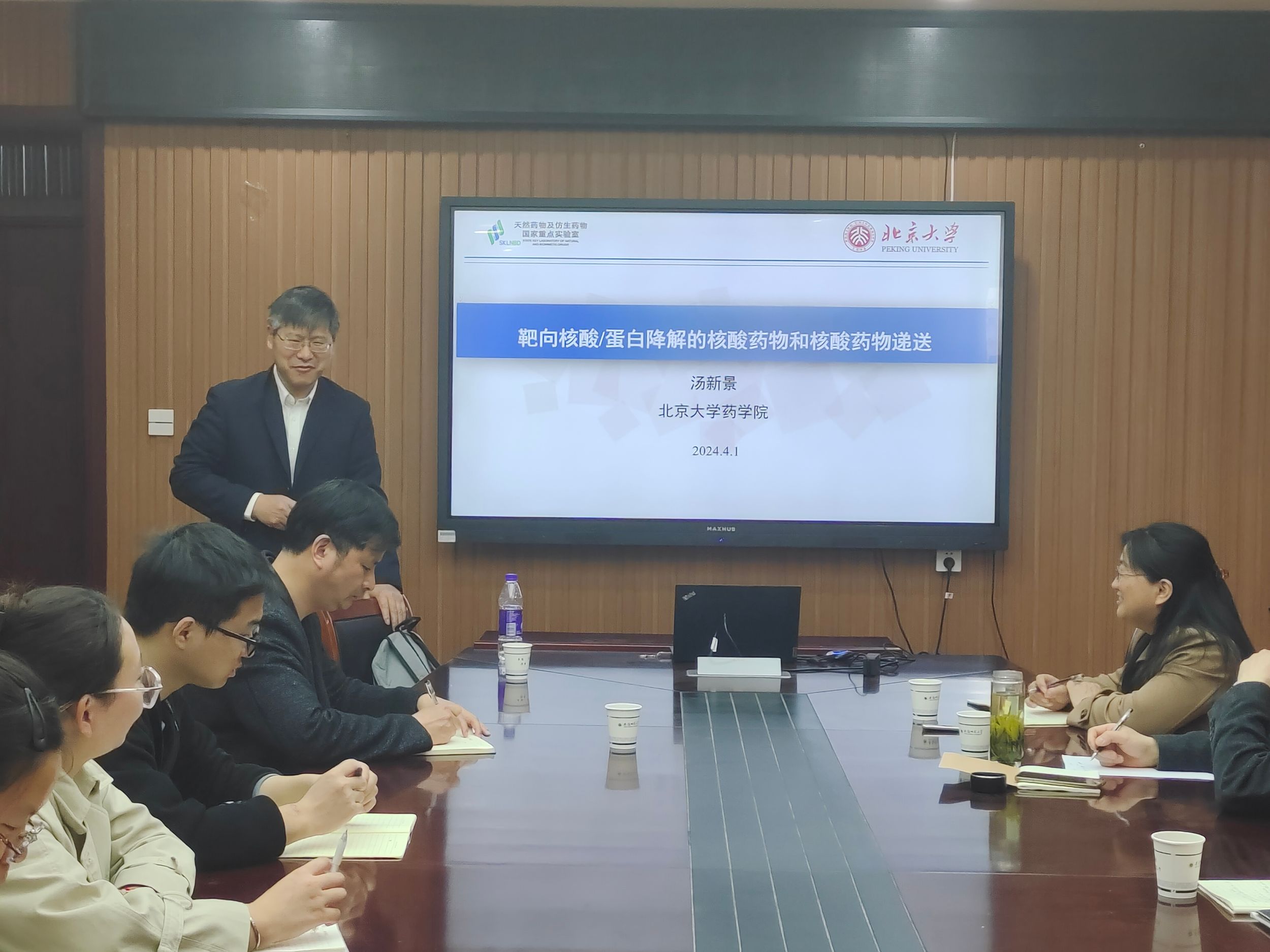 汤新景教授作了题为“靶向核酸/蛋白水解的核酸药物及核酸药物递送”的学术报告。汤教授首先介绍了靶向核酸降解的嵌合核酸药物、靶向蛋白水解的嵌合核酸药物、载体自组装核酸药物的递送等三个方面的内容,随后汤教授详细介绍了核酸药物在小鼠上的实验结果以及未来的实验计划。最后汤教授就报告内容作 了总结并回答了与会师生提出的问题。