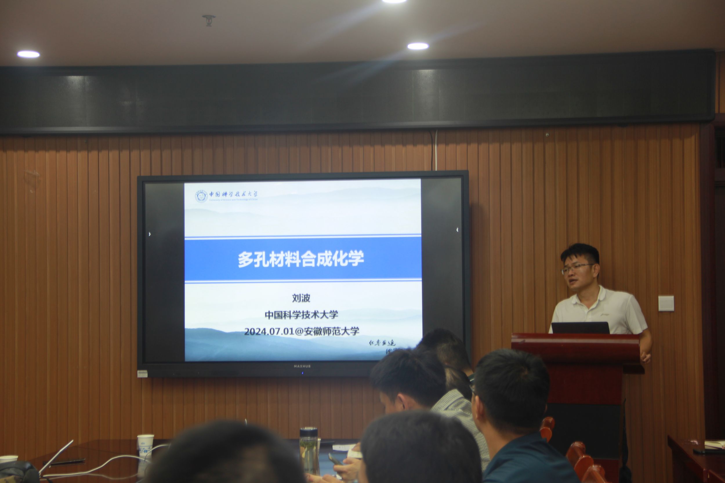 刘波教授作了题为“多孔材料合成化学”的学术报告。刘教授阐述了多孔材料是无机合成材料化学的一个重要研究分支,在气体分离与存储、催化、电极材料、能源化学等诸多领域具有重要且广泛的应用和理论研究意义。多孔材料的核心科学问题包括以下几个方面:孔径分布及其调控、孔结构微环境、孔内多功能性协同作用、稳定性和可加工性、新型多孔材料开发等。会后,刘波教授与参会师生展开了一系列学术讨论,并回答了与会师生提出的问题。