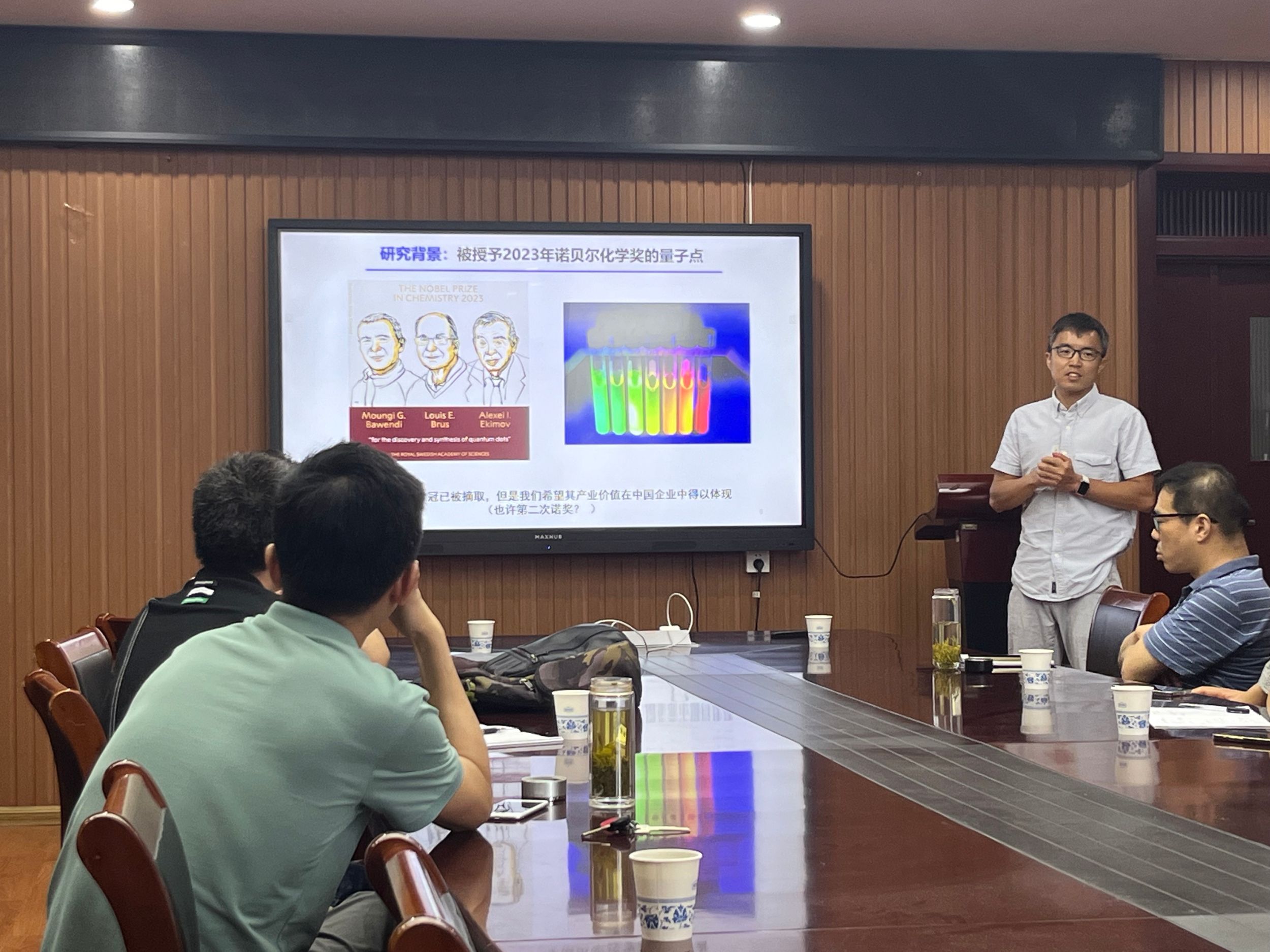 樊逢佳教授作了题为“从电子空穴到光子:高性能量子点LED机制研究”的学术报告。樊教授首先对自身学术经历与学术成果进行了简要的介绍,并详细阐述了量子点的由来、发展与应用。随后,樊教授从量子点与OLED和Micro- LED的不同点对比出发,引出量子点发光的优势—发光波长窄、对人体负面影响小、成像效果好等特点。而目前量子点研究也面临着许多挑战如效率、使用寿命等。樊教授团队针对这些挑战展开了研究,通过提升电子空穴复合速率来降低电压,利用自研仪器发现了超长寿命热电子等工作;提出了热点子是量子点LED的“万恶之源”,并分享了一些技术发明和方法创新。会后,樊逢佳教授就报告内容与在场师生进行了讨论和交流。