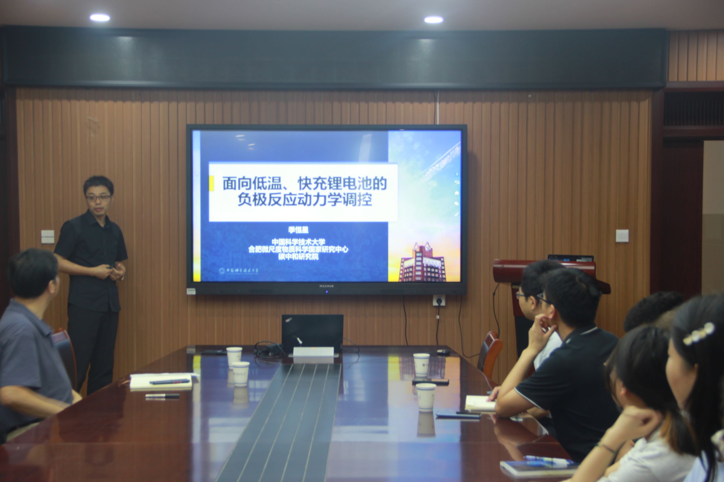 季恒星教授作了题为“面向低温、快充锂电池的负极反应动力学调控”的学术报告。季教授首先介绍了研究的背景与意义,发展低温、快充锂离子电池有利于降低石油对外依存度,助力“双碳”目标实现。随后季教授讲解了锂离子电池的技术挑战,锂离子电池的能量密度、功率密度、安全性难以兼顾。最后季教授提出了三个锂离子电池发展的限制因素,第一是电极结构,牺牲电池能量密度来提高功率密度是目前高功率电池体系的无奈之举;第二是电极极化,电化学体系的电极极化无法避免,极化降低电池容量;第三是电池负极,负极析锂会引起安全隐患,并且负极容量严重衰减会限制电池容量挥发。会后,季恒星教授与与会师生展开了一系列学术讨论,并回答了与会师生提出的问题。