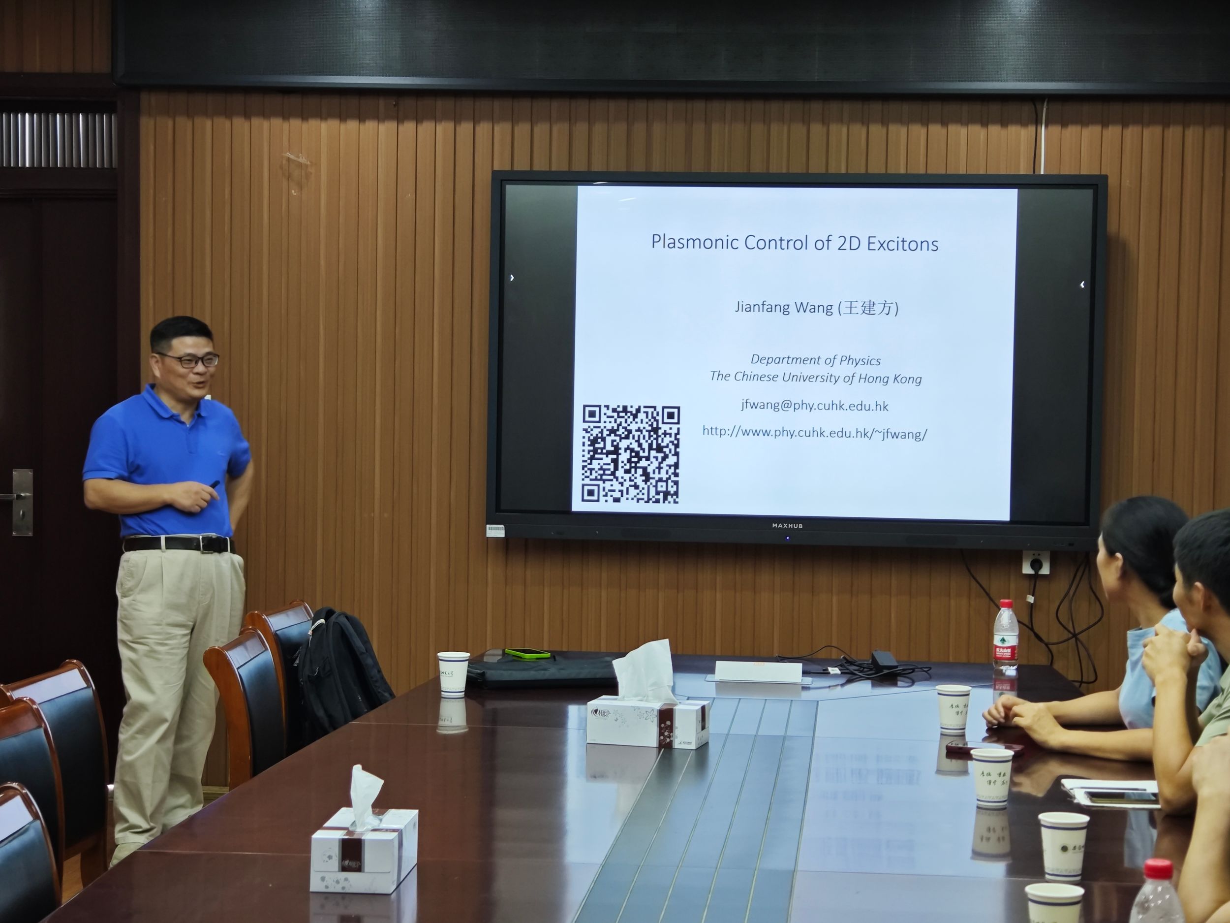 王建方教授作了题为“表面等离激元和二维激子的相互作用”的学术报告。王建方教授首先讲解了二维激子的等离子体控制、局域表面等离子体共振现象,并介绍了一系列胶态金属纳米粒子以及等离子体的应用。随后王教授从控制等离子体共振波长、使局部电场增强两个方面阐述了制造不同形状、大小和成分的金属纳米晶的原理。最后王教授总结了等离子体金属纳米粒子的合成、手性等离子体纳米粒子、二维激子的等离子体控制三个方面的内容。会后,王建方教授与与会师生展开了一系列学术讨论,并回答了与会师生提出的问题。