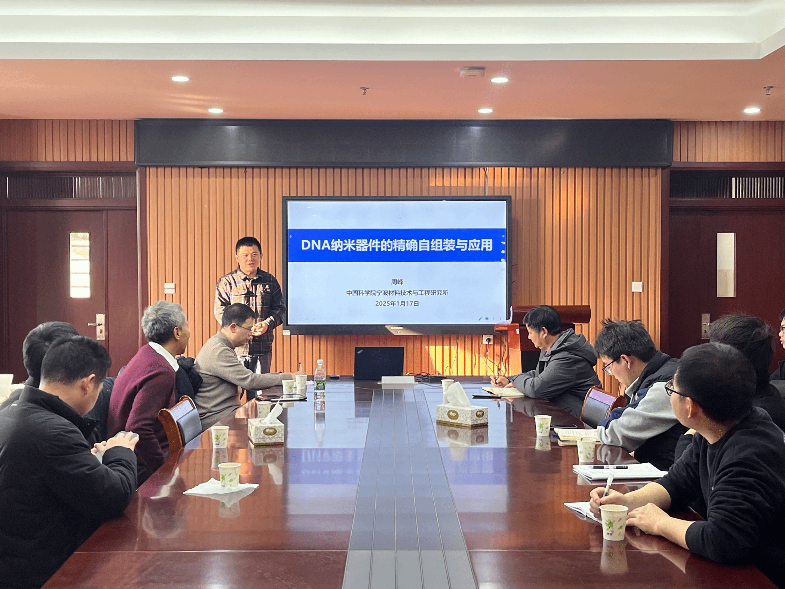 周峰博士作了题为“DNA纳米器件的精确自组装与应用”的学术报告。周博士首先介绍了DNA纳米材料的多功能应用,随后重点阐述了DNA折纸法作为制备DNA纳米结构的关键技术。在此基础上,提出了一种基于模板的人工自我复制方法,用以实现高效的DNA纳米材料制备。通过探索人工自我复制过程,报告展示了DNA材料如何经历从无到有的演变,体现了变异、选择和进化的机制。接着,周峰博士探讨了如何通过重新思考一维模板的人工自我复制经验,提出了三维材料自我复制的新方法。具体而言,采用降维、基于模板的自我复制,再通过升维的思路,来构建更复杂的DNA纳米结构。此外,报告还介绍了DNA三维工业纳米机器人的构建,通过精确设计动态折叠的三维中间体结构,实现了整个动态操控过程的验证。此技术不仅推动了催化生产和自我复制的研究,也为手性材料的制造开辟了新路径。最后,周峰博士介绍了微流控芯片的制造与组装,展示了DNA纳米材料在先进制造领域中的应用潜力。会后,周峰博士与参会师生就报告内容展开了一系列讨论,并回答了与会师生提出的问题。