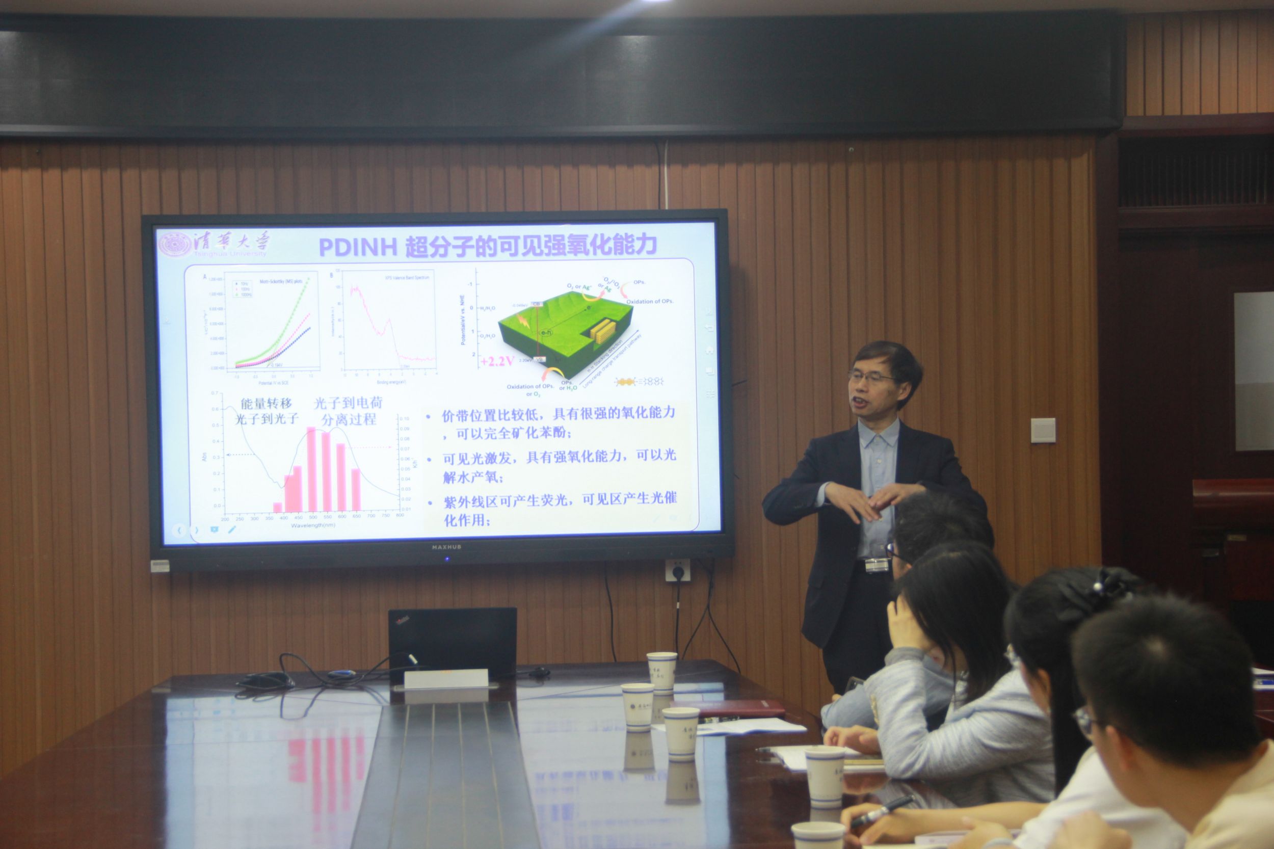朱永法教授作了题为“有机半导体可见光催化产氢及二氧化碳还原研究”的学术报告。朱永法教授从能源和环境的角度出发,引出有机半导体材料在可见光催化产氢、环境净化方面的研究创新和突破,展示了课题组在有机半导体光催化剂制备上的一系列重要成果,通过结晶度提升内建电场促进光催化性能增强,朱教授团队将PDI与尿素结合成功构建了一种高结晶聚合物PDI-尿素,提高了催化剂的可见光活性。在通过分子结构设计调控还原能力和电荷传输性能中朱教授介绍了卟啉超分子可见光催化产氢产氧和锌卟啉提升还原能力和产氢性能两个研究课题。最后朱教授介绍了在有机半导体可见光催化还原CO2的研究,课题组开展了CO2光催化还原合成C2H4研究、光热催化两步法CO2光合成C6糖等研究给了大家在可见光催化方面的研究提供了新的思路。会后,朱教授与在场师生积极互动,回答了师生们的问题。