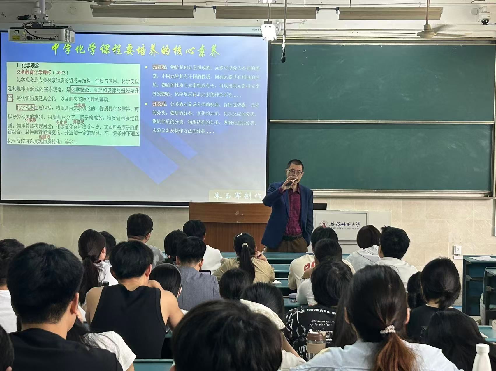 15日上午,朱玉军围绕《核心素养为本的教学课例研究与论文写作》展开讲座。讲座伊始,朱玉军聚焦当前教学瓶颈与教师专业发展问题,指出核心素养为本的教学要融通五维框架并结合多个初高中化学教学典型案例,深入剖析了当前教学中常见的问题,通过生动、精彩的案例指出在化学教学过程中需要在研究教材前后知识之间的联系上下工夫,调动员工的已有知识来学习新知识。在课例研究部分,朱玉军系统阐释了优质课例的标准与写作框架。他特别强调论文写作过程中文献研究的重要性,建议教师通过深挖文献资料,发现教学改进的创新点,同时注重课堂实录的细节呈现,避免空泛的理论阐述。