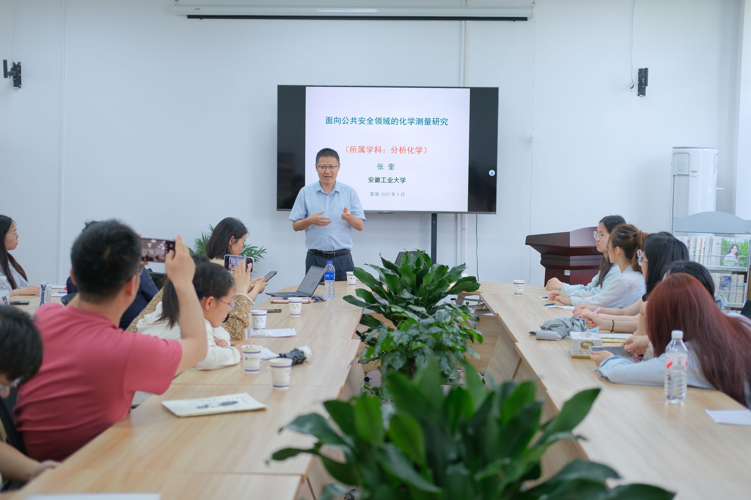 张奎教授作了题为“面向公共安全领域的化学测量研究”的学术报告。张奎教授首先介绍了课题组研究工作背景,指出公共安全化学测量关系到国家安全与社会稳定,是当前亟需突破的关键方向。随后,他详细阐述了公共安全化学测量的发展方向与核心科学问题,强调光学探针在快速检测中起到“眼睛”的作用。围绕“如何实现化学探针的快速检测技术”,张教授提出了系统的研究思路。在具体工作方面,课题组致力于拓宽重构探针的检测灵敏度和浓度检测范围,发展了具有检测、吸附与去除三重功能的纳米探针,实现了铀酰的快速可视化检测。同时,团队还通过聚合物负载荧光探针,结合静电纺丝技术,以聚乙烯吡咯烷酮为基质,成功制备了纳米纤维检测试剂条,可在0–10 ppm的低浓度范围内实现快速识别,并对气相神经毒剂模拟剂实现低至5 ppm的特异性快速检测。此外,课题组还开发了基于血红蛋白抑制超氧自由基与空穴诱导机制的长余辉纳米棒颗粒,用于血迹追踪中的光漂白技术研究,展现出在公共安全检测中的广阔应用前景。会后,张奎教授与参会师生就报告内容展开了一系列讨论,并回答了与会师生提出的问题。