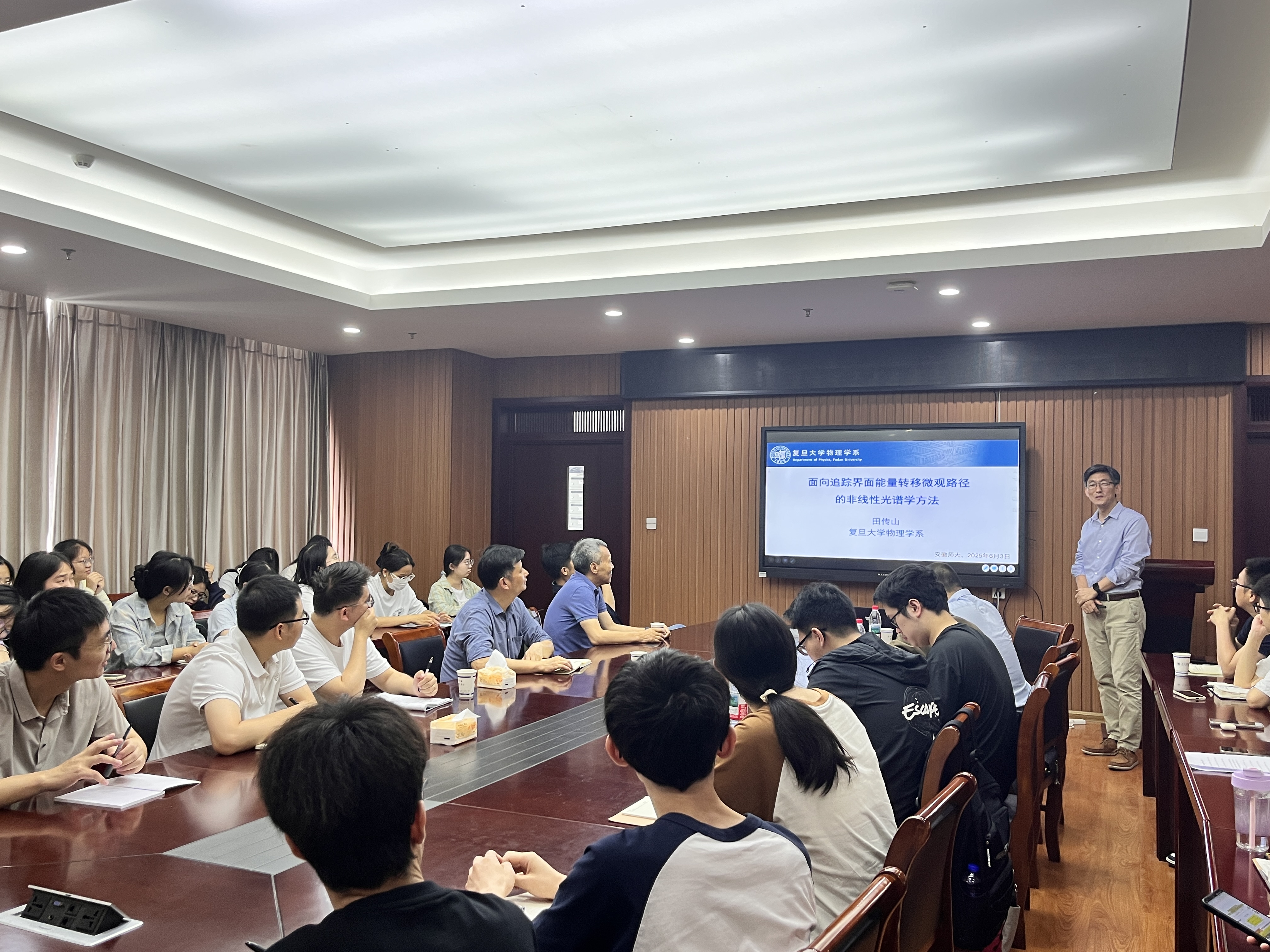 田传山教授作了题为“面向追踪界面能量转移微观路径的非线性光谱学方法”的学术报告。田教授首先阐述了发生在物质界面上的量子限制效应和邻近效应带来了许多新奇物理、化学现象,极大丰富了我们对物性调控的手段。因此,发展界面敏感的原位探测和调控方法,是阐明界面器件微观机制、优化器件效率的关键。非线性光谱学作为谱学表征手段,为原位揭示光与物质相互作用的规律、阐明物质的构效关系、进而推动物质科学及相关领域的发展起到了重要的作用。随后,田教授详述了其课题组聚焦层析界面非线性光谱学新方法和界面敏感的太赫兹非线性谱学技术,及其在解析界面微观结构和化学反应过程的若干应用,并展望了界面非线性光谱学方法在追踪界面能量转移和化学反应的微观动力学过程的潜力。会后,田传山教授就报告内容与到场师生展开讨论,并回答了与会师生提出的问题。