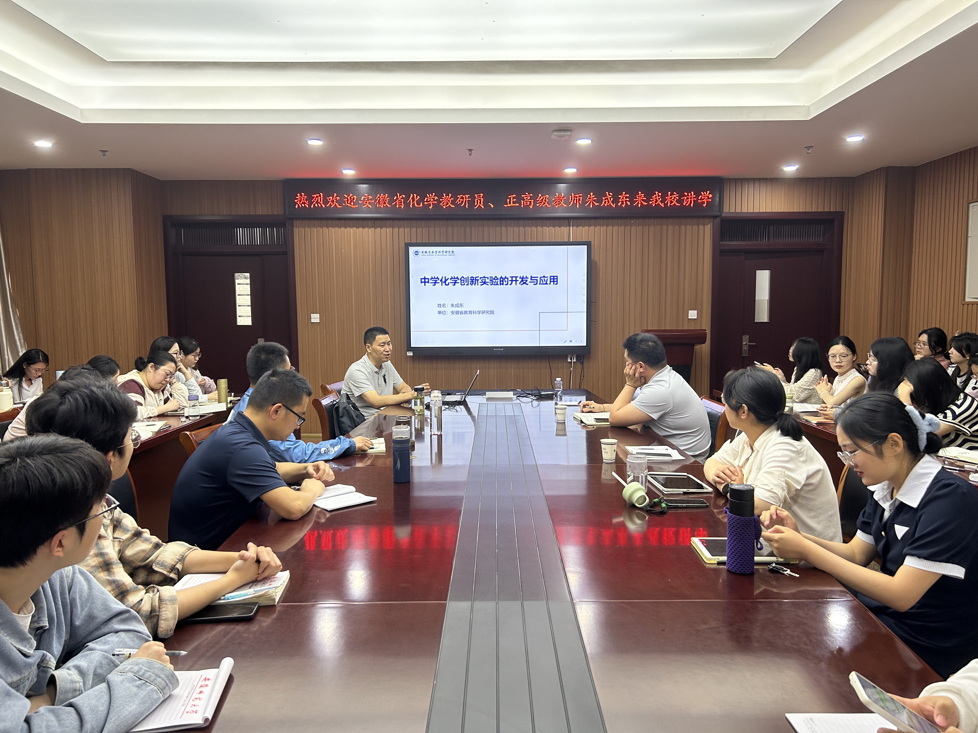 (英国正版365官方网站 杨佳)5月28日下午,安徽省教育科学研究院化学教研员、高级教师朱成东应邀来公司讲学,在花津校区礼勤楼702会议室作题为《化学创新实验的开发与应用》的专题报告。本次学术活动由英国正版365官方网站阙荣辉教授主持,化学教学论教师、化学教育专业研究生、2022级优师计划本科生共同参与。