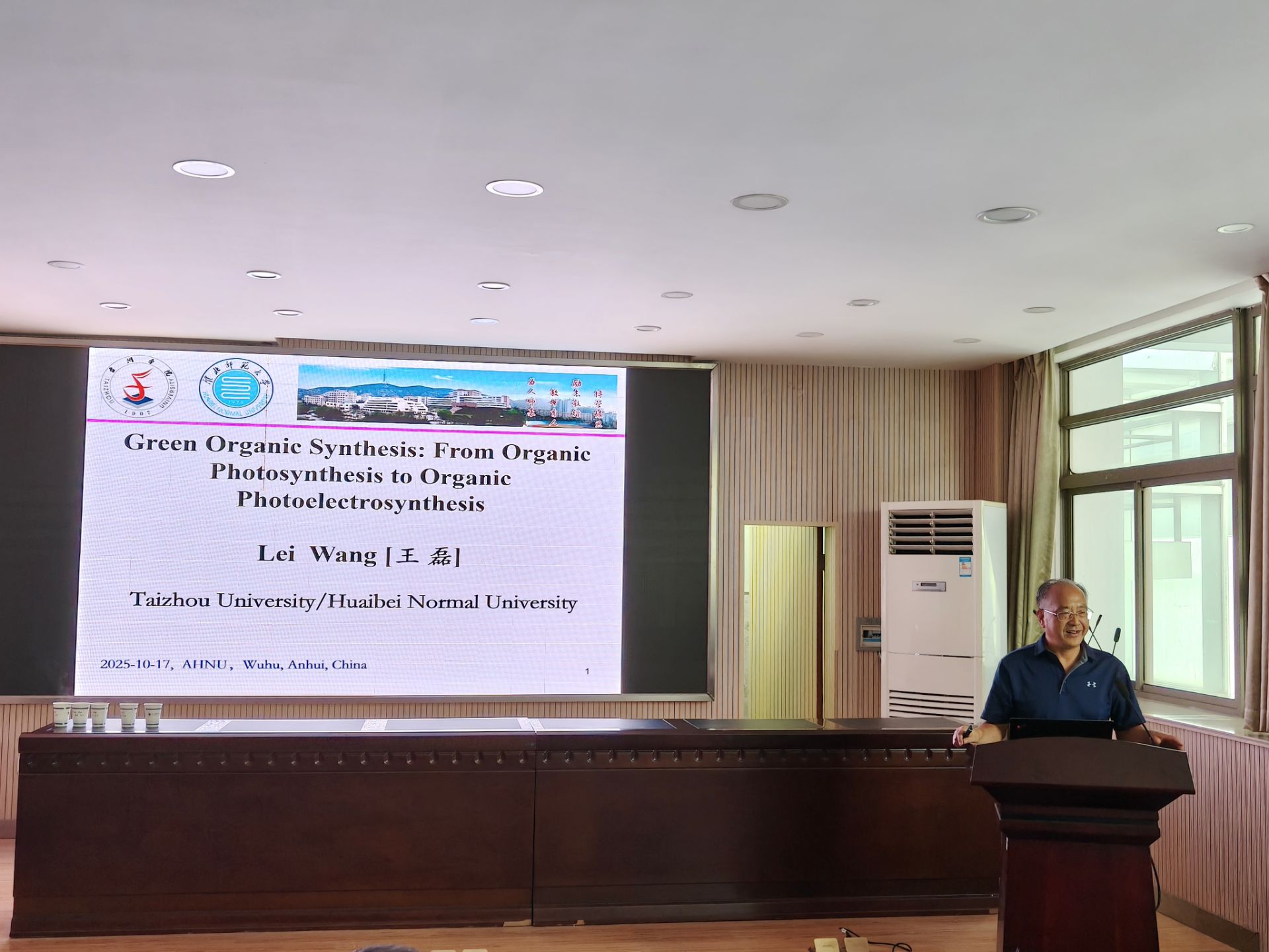 王磊教授作了题为“Green Organic Synthesis: From Organic Photosynthesis to Organic Photoelectrosynthesis”的学术报告。王教授主要围绕绿色有机合成这一主题,介绍了从有机光合作用到有机光电合成的多种策略和方法。