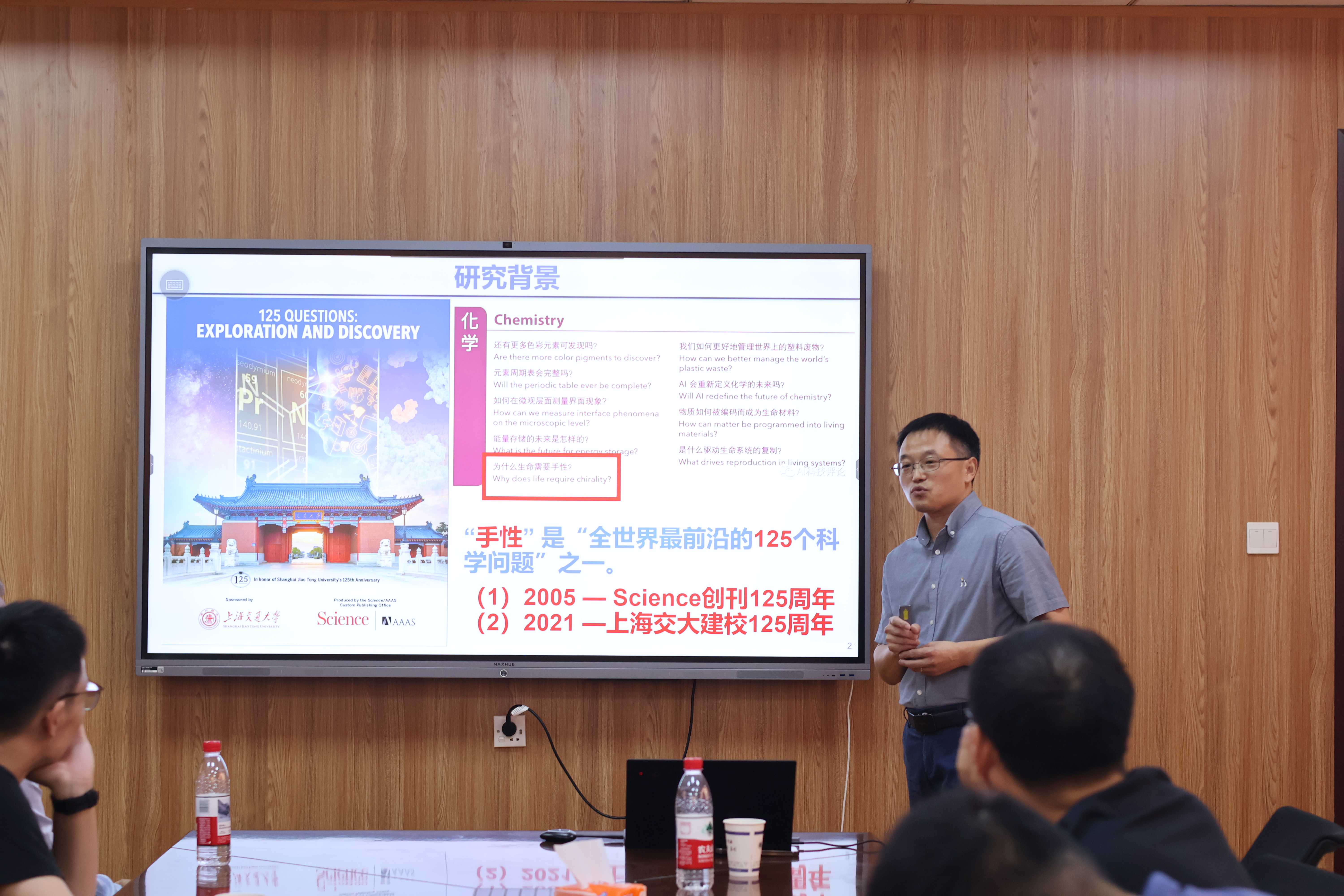 张伟教授作了题为“高分子多层次手性精准构筑及应用”的学术报告。张教授介绍了多层次手性的研究对于理解生命起源、进化和功能表达至关重要,并向我们讲解了高分子介观手性结构精准构筑的挑战,由于介观手性结构决定高分子材料的手性结构,介观手性结构构筑与调控的高效策略缺乏以及动态性与稳定性难以兼容成为主要问题。张教授向我们介绍了原位构筑高分子介观手性结构的新策略:聚合诱导手性自组装,此策略实现了可控的手性转移、传递和放大,通过调控高分子链内链间相互作用,实现了介观手性结构的高效构筑及精准控制。接着介绍发展部分共价键交联驱动的手性自修复策略,兼顾了介观手性结构的动态性和稳定性。通过控制多层次手性协同相互作用,实现了高分子介观手性的功能应用。会后,张伟教授与参会师生展开了一系列学术讨论,并回答了与会师生提出的问题.
