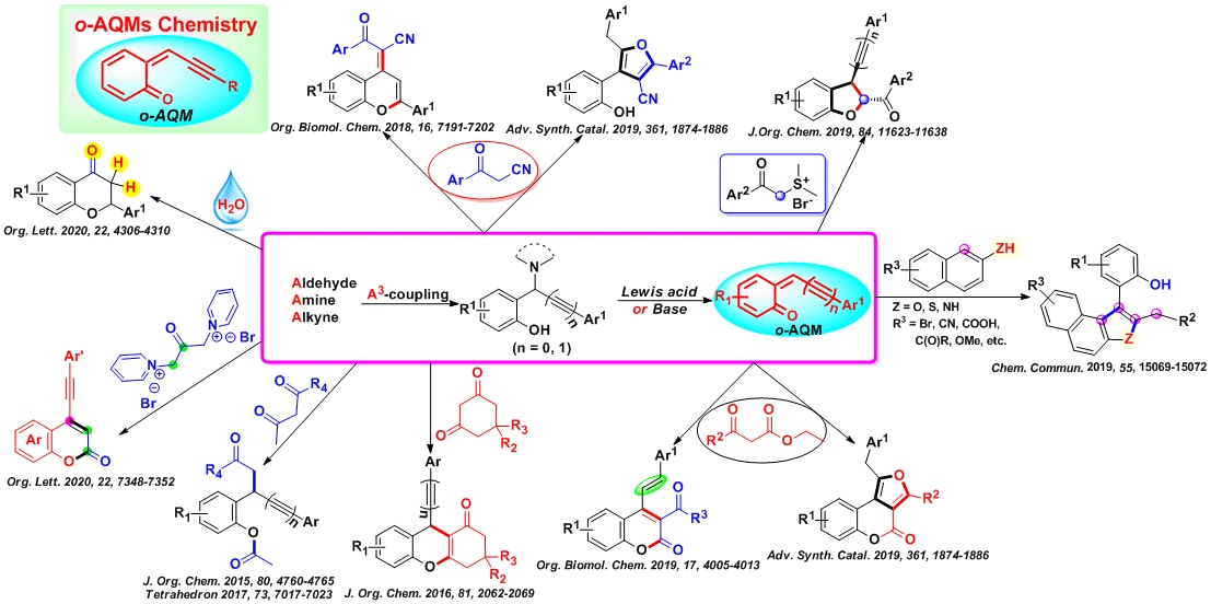 本课题组主要从事过渡金属催化的多组分串联反应和基于邻亚甲基苯醌(o-AQMs)1,4-共轭加成/分子内环化串联反应合成杂环化合物的研究。近年来主要围绕具有多反应位点的高活性反应中间体o-AQMs的化学转化及其反应性开展相关研究,发展了其与不同亲核试剂(2-萘酚、苯甲酰硫叶立德、α-羰基活泼亚甲基化合物等)1,4-共轭加成/分子内环化串联新反应及多种结构新颖含氧杂环化合物的合成新方法,研究成果先后在Org. Lett., Chem. Commun., Adv. Synth. Catal., J. Org. Chem., Org. Biomol. Chem., TetrahedronSCI核心期刊上发表。同时在过渡金属催化的重氮化合物的C-H官能化和环加成反应等方面也开展了部分研究工作,并取得了一定研究结果。