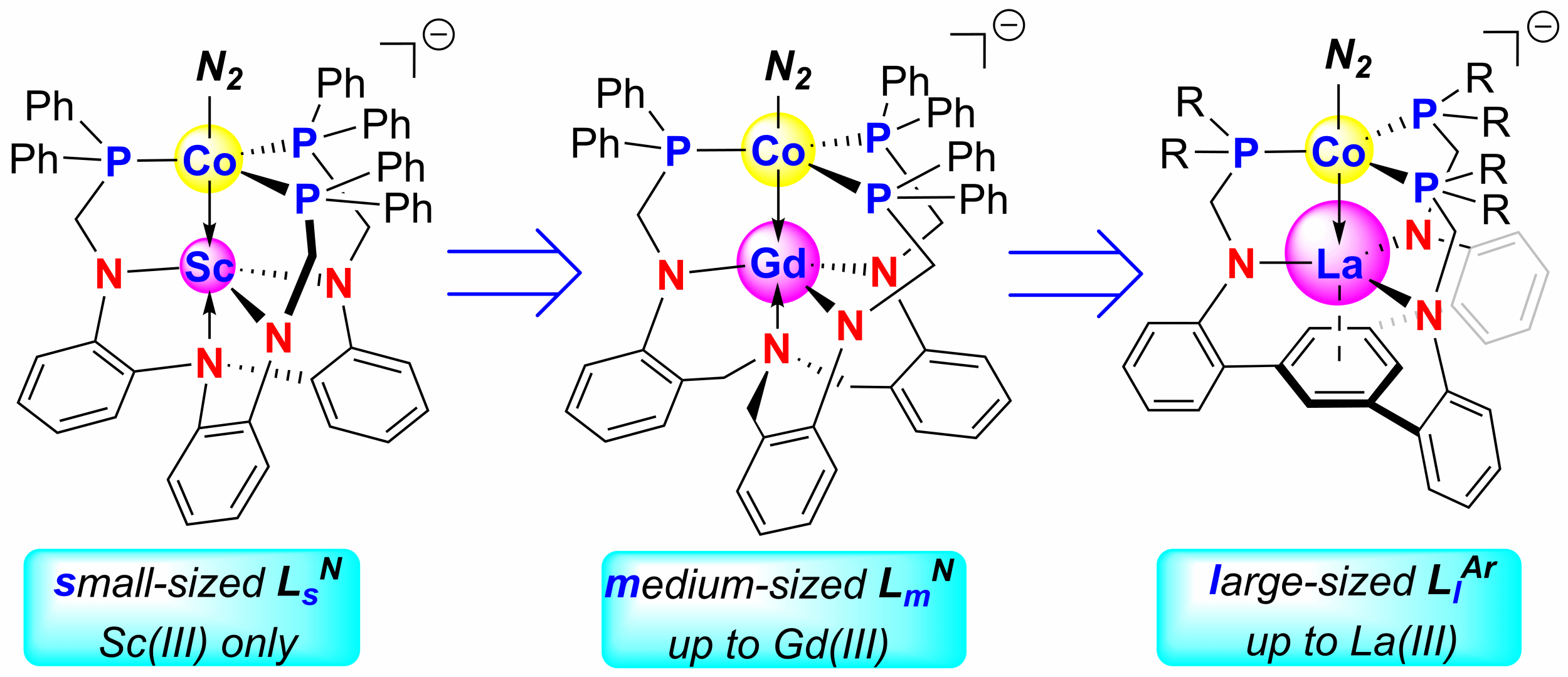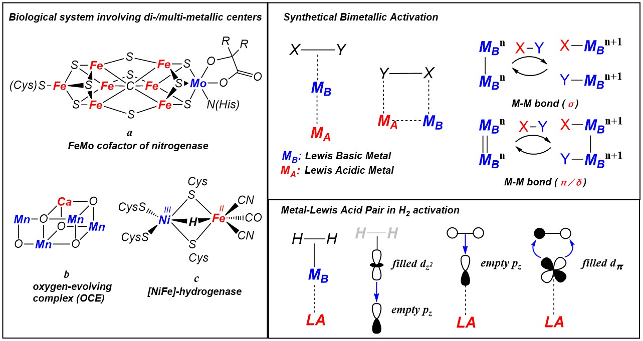杂核金属配合物对于N2, H2, O2等重要小分子的活化转化具有举足轻重的作用。生物体系中固氮酶的FeMo辅因子,光系统Ⅱ中放氧复合物的活性中心Mn4O5Ca,以及[NiFe]氢化酶,都含有两种性质不同的金属离子。在杂金属体系中,由于金属中心性质的差异,对底物进行活化时的模式和作用是不同的:1)通过金属间相互作用调控不同金属中心的电性;2)不同的金属中心对底物进行协同活化;这些传统的单金属以及同核双金属体系中是难以实现的。