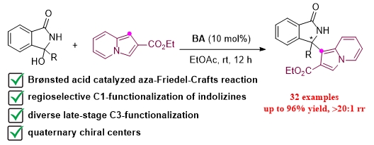 25)Zhiming Zhu, Qianling Wu, Xiaoxiao Song* and Qijian Ni*. Thermodynamic Controlled Regioselective C1-Functionalization of Indolizines with 3-Hydroxyisoindolinones via Brønsted Acid Catalyzed aza-Friedel–Crafts Reaction, J. Org. Chem. 2024, 89,2794-2799.link